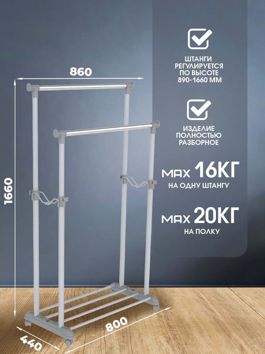 Вешалка напольная гардеробная Sheffilton CH-4149, 1660×860×440мм, регулируемая, металл серый/хром, пластик темно-серый, передвижная, 2 штанги, В1-66
