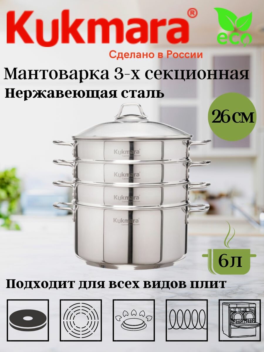 Мантоварка Kukmara 3в1 6,0 литров, диаметром 26см, 3 секции, со стеклянной крышкой