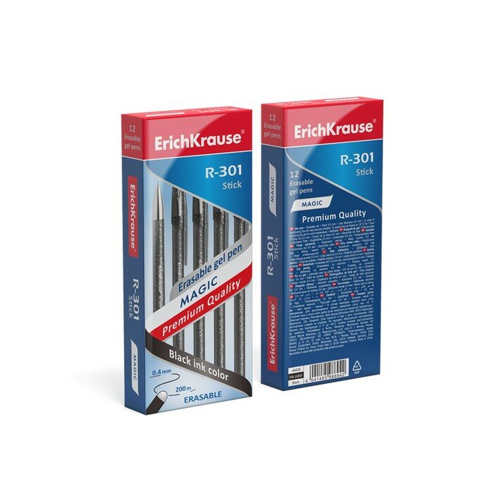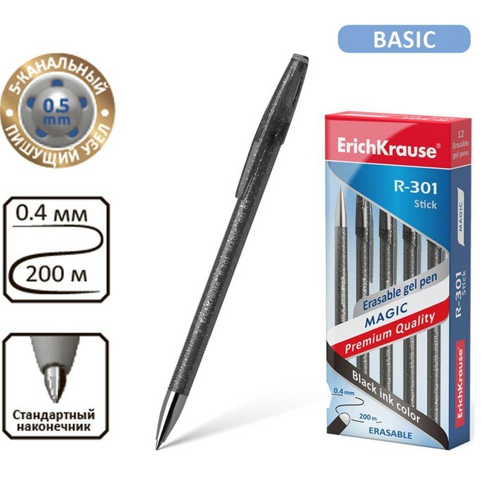 Ручка гелевая стираемая Erich Krause R-301 Magic Gel, узел 0.5 мм, чернила чёрные, длина письма 200 м, цена за 1 шт(12 шт.)