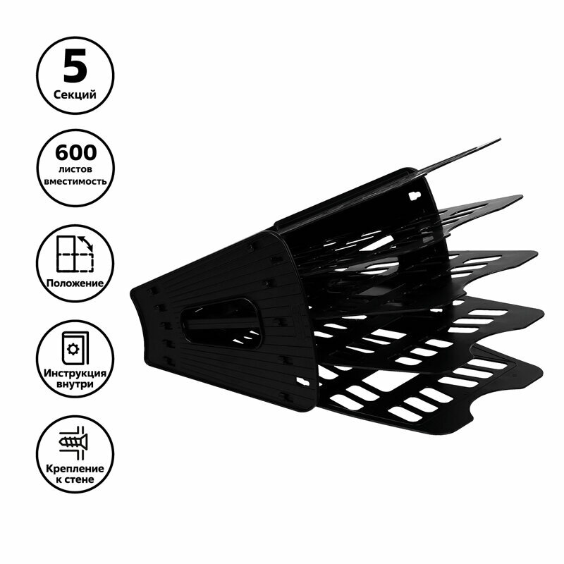 Лоток-веер для бумаг, 5 секций, 4 отделения, чёрный