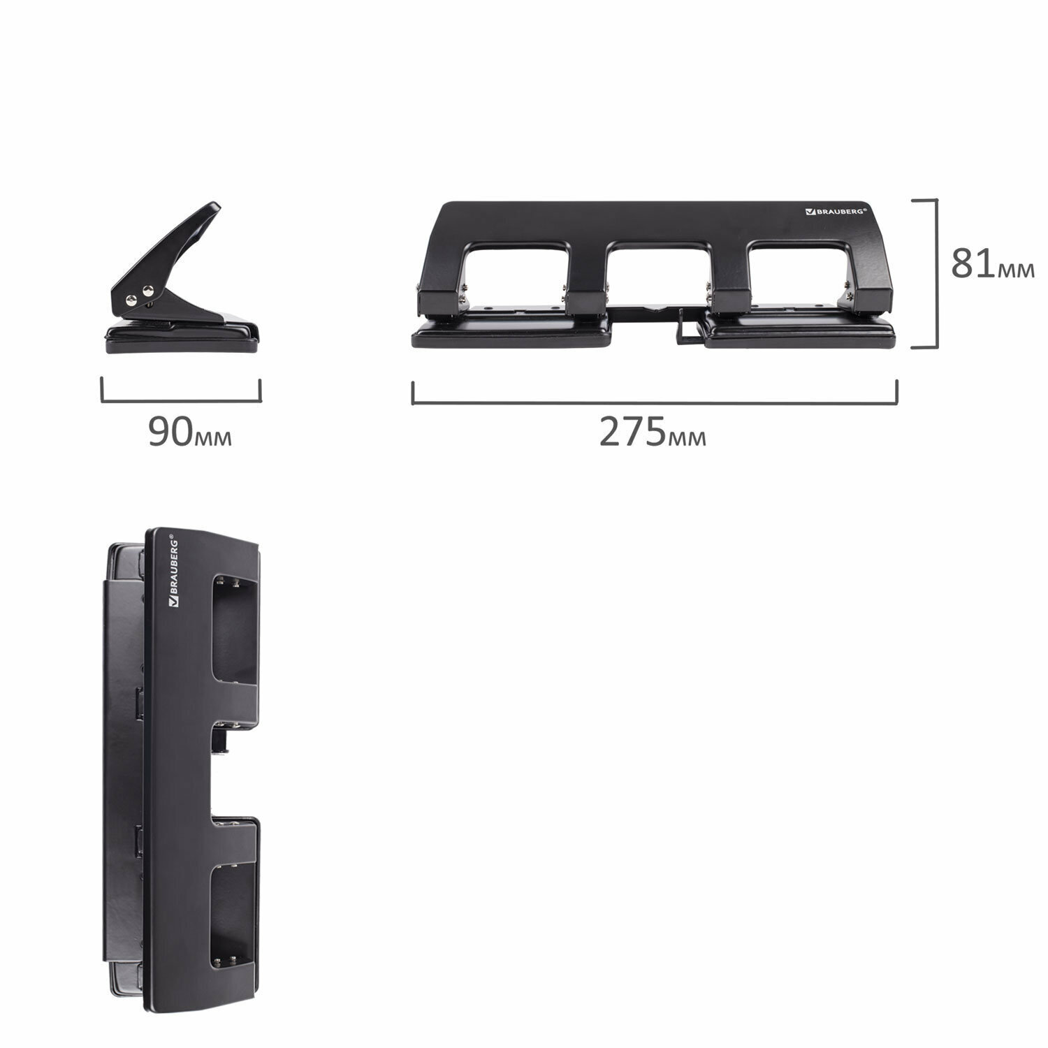 Дырокол металлический на 2-4 отверстия BRAUBERG "HL-4", комплект 3 шт., до 15 л, черный, 221160