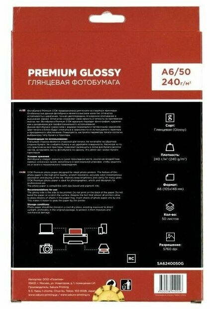 Sakura Фотобумага Sakura A4 240г 20л SA4240020G глянцевая