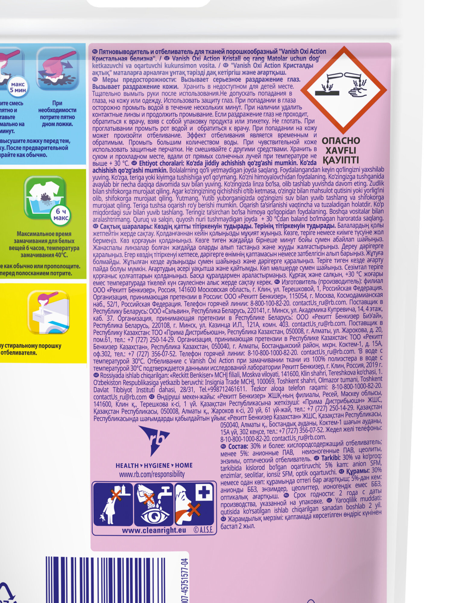 Пятновыводитель и отбеливатель для тканей порошкообразный 'Vanish Oxi Action Кристальная белизна' 500 г