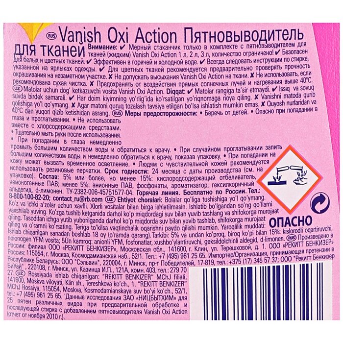 Ниже Вы можете прочитать отзывы на Vanish Oxi Action Кислородный жидкий пятновыводитель, для цветных тканей и белья, 450 мл, ознакомится с подробными характеристиками, посмотреть интересные обзоры и фотографии на Vanish Oxi Action Кислородный жидкий пятновыводитель, для цветных тканей и белья, 450 мл.