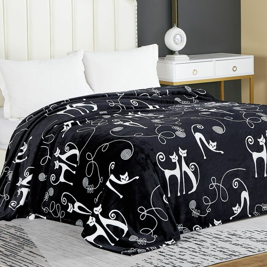 Плед двуспальный 180х200 черный с котятами, покрывало на кровать и диван Cleo California, пушистый с рисунком, флисовый, велсофт