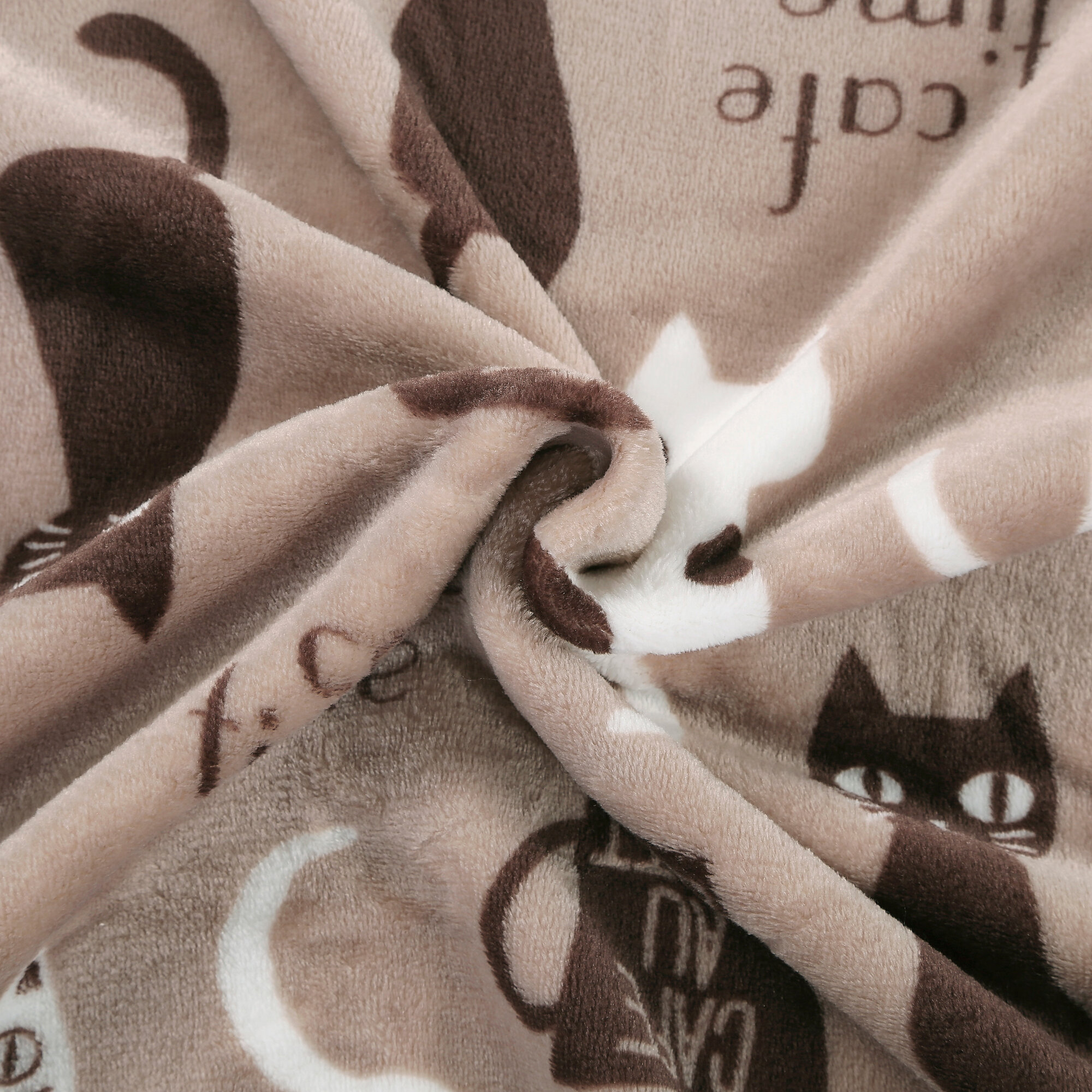 Плед двуспальный 180х200 черный с котятами, покрывало на кровать и диван Cleo California, пушистый с рисунком, флисовый, велсофт