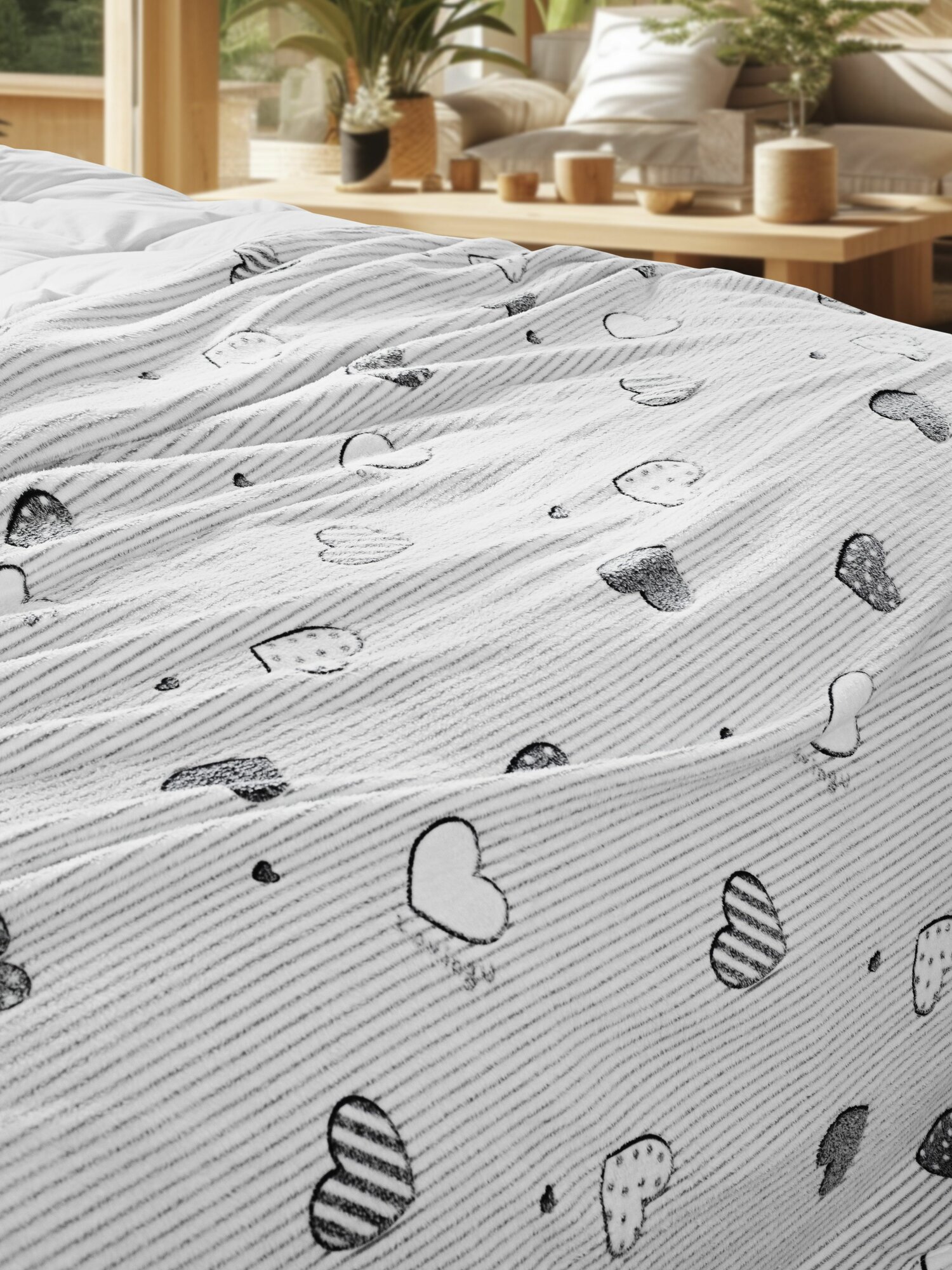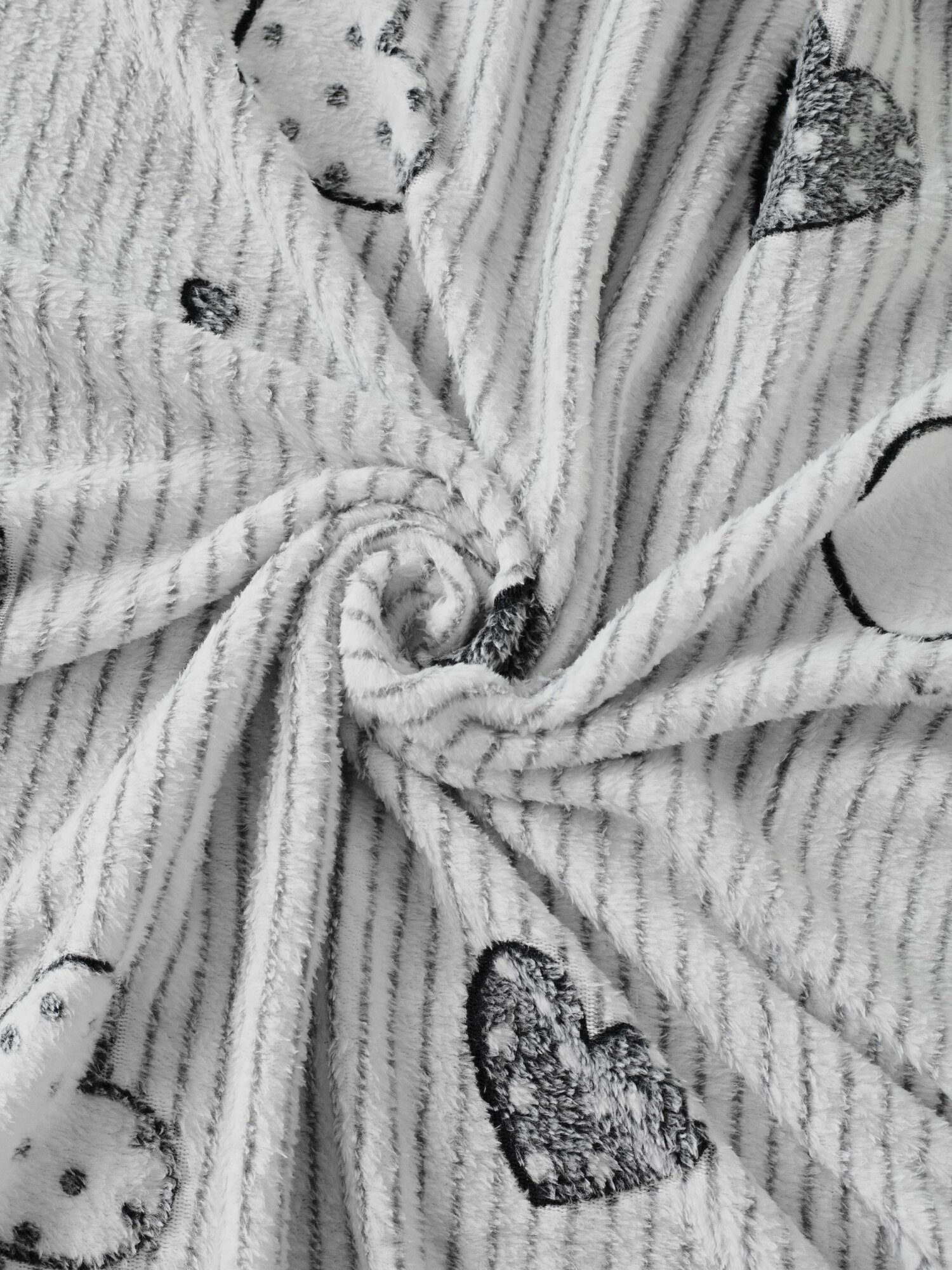 Плед полуторный 150х200 серый с сердечками, покрывало на кровать и диван Cleo California, пушистый с рисунком, флисовый, велсофт