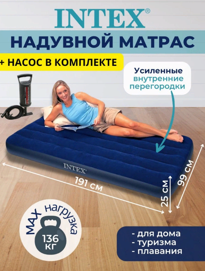 Матрас надувной Intex, 191х76х25 см, 64756, флокированный, 136 кг