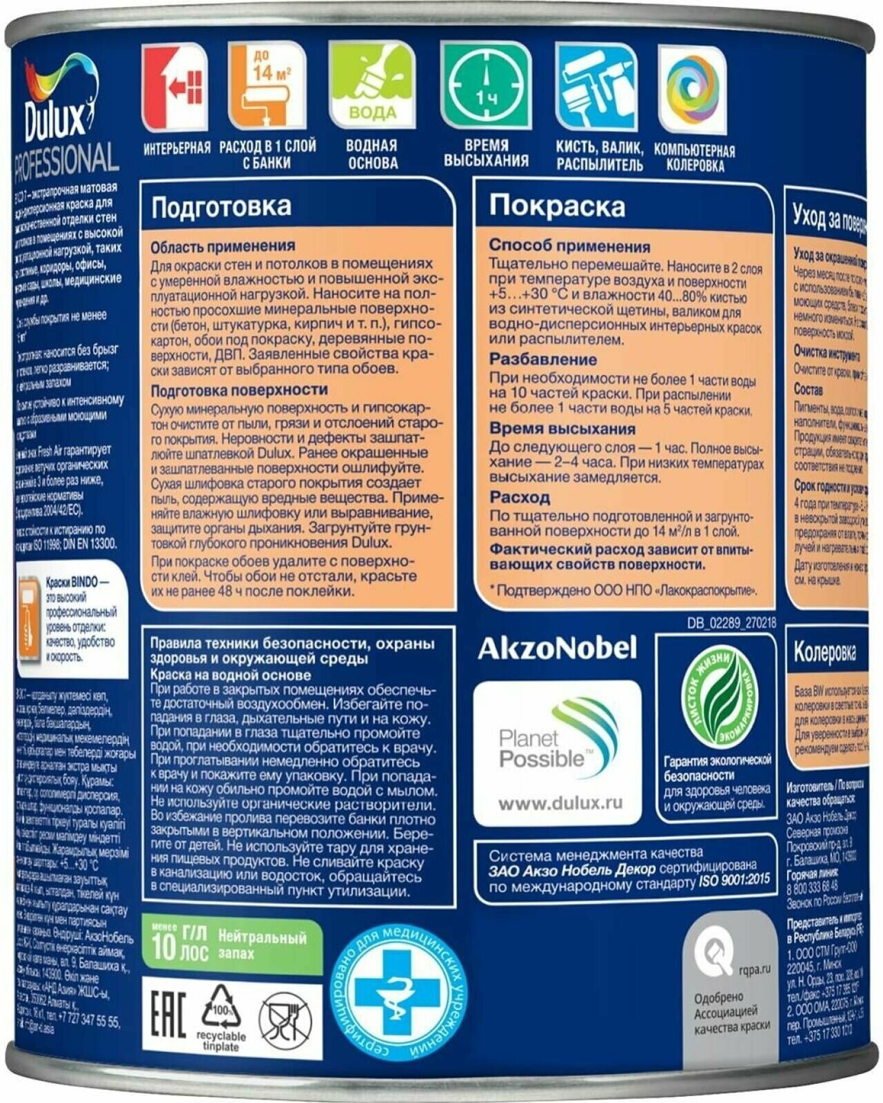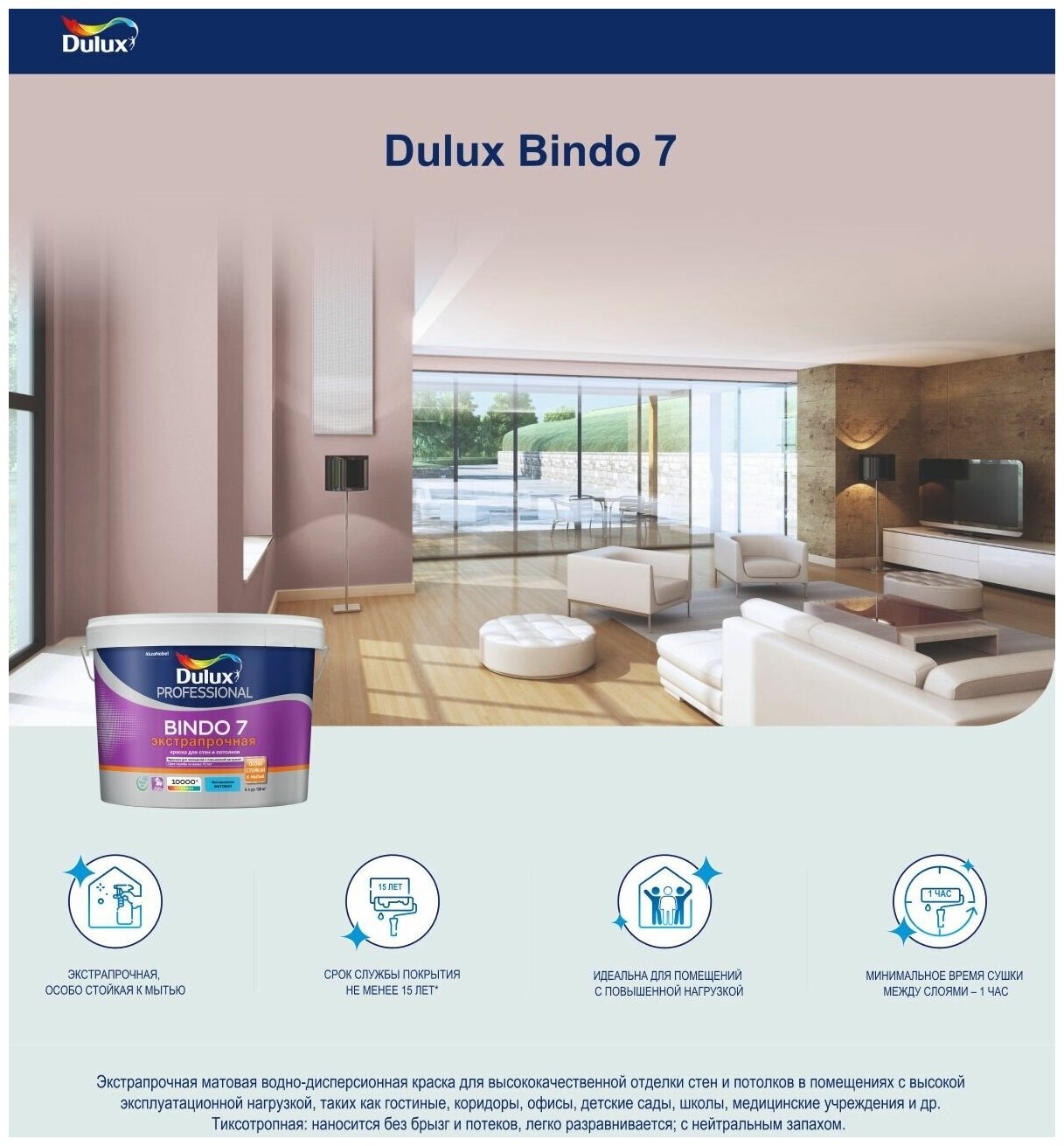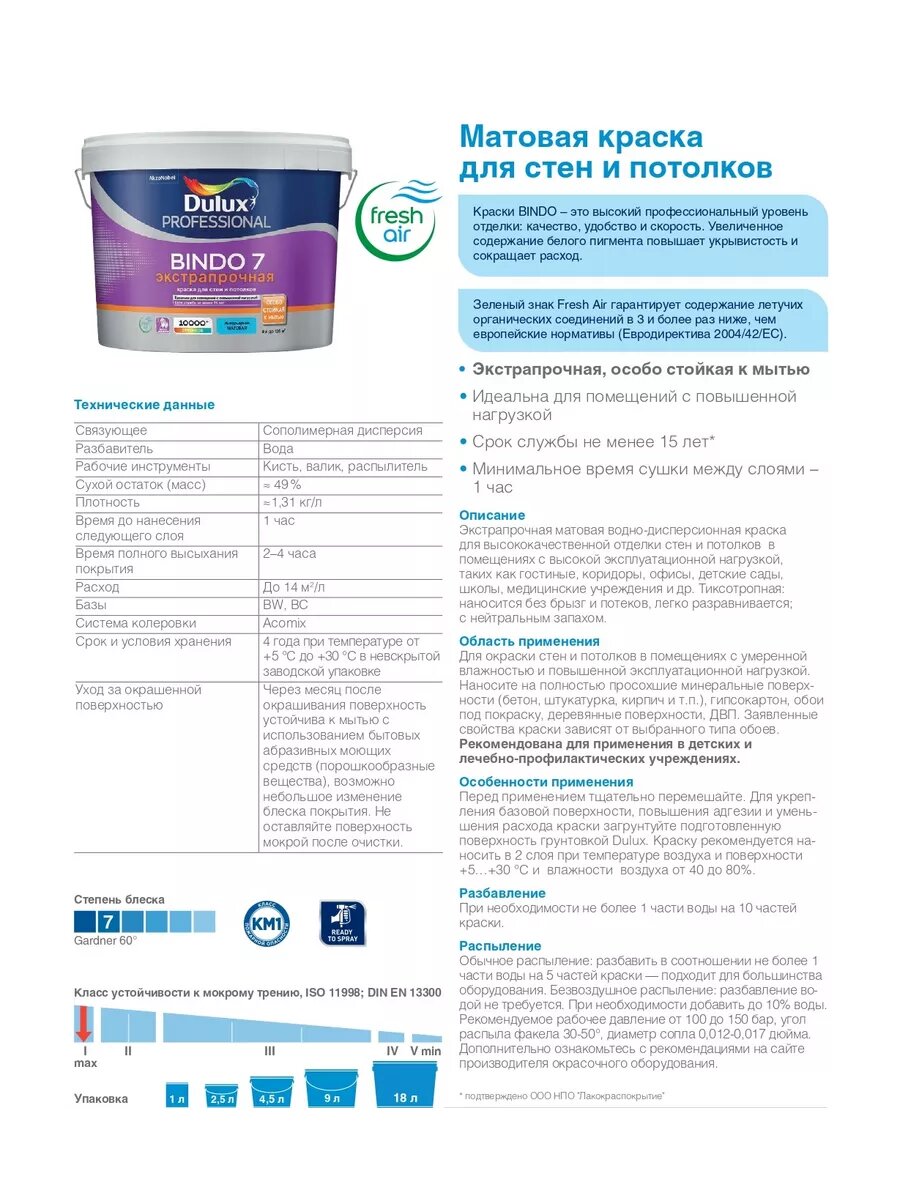 Краска DULUX BINDO 7 экстрапрочная для стен и потолков, матовая, бесцветная, База BC 2,25