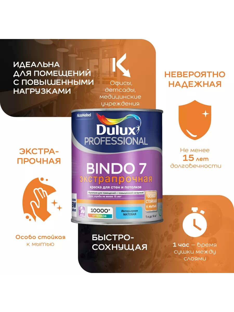 Краска для стен и потолков Dulux Professional Bindo 7, латексная экстрапрочная, матовая база BW 1 л.