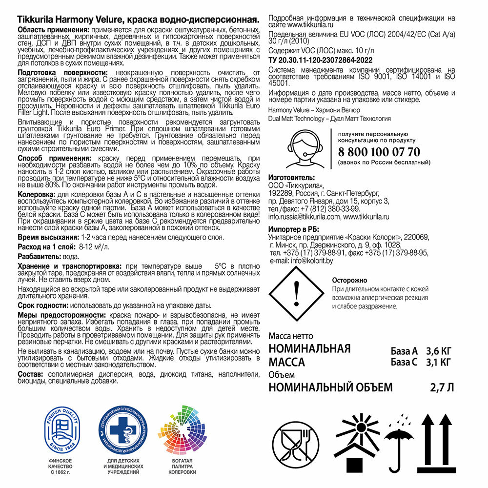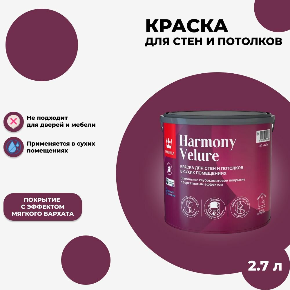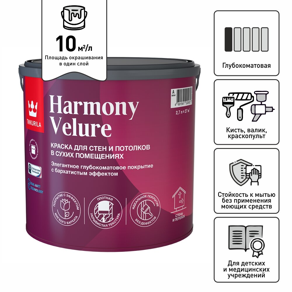Tikkurila Harmony Velure / Тиккурила Гармония Велюр глубокоматовая краска для стен и потолков 2,7л база А (белая)