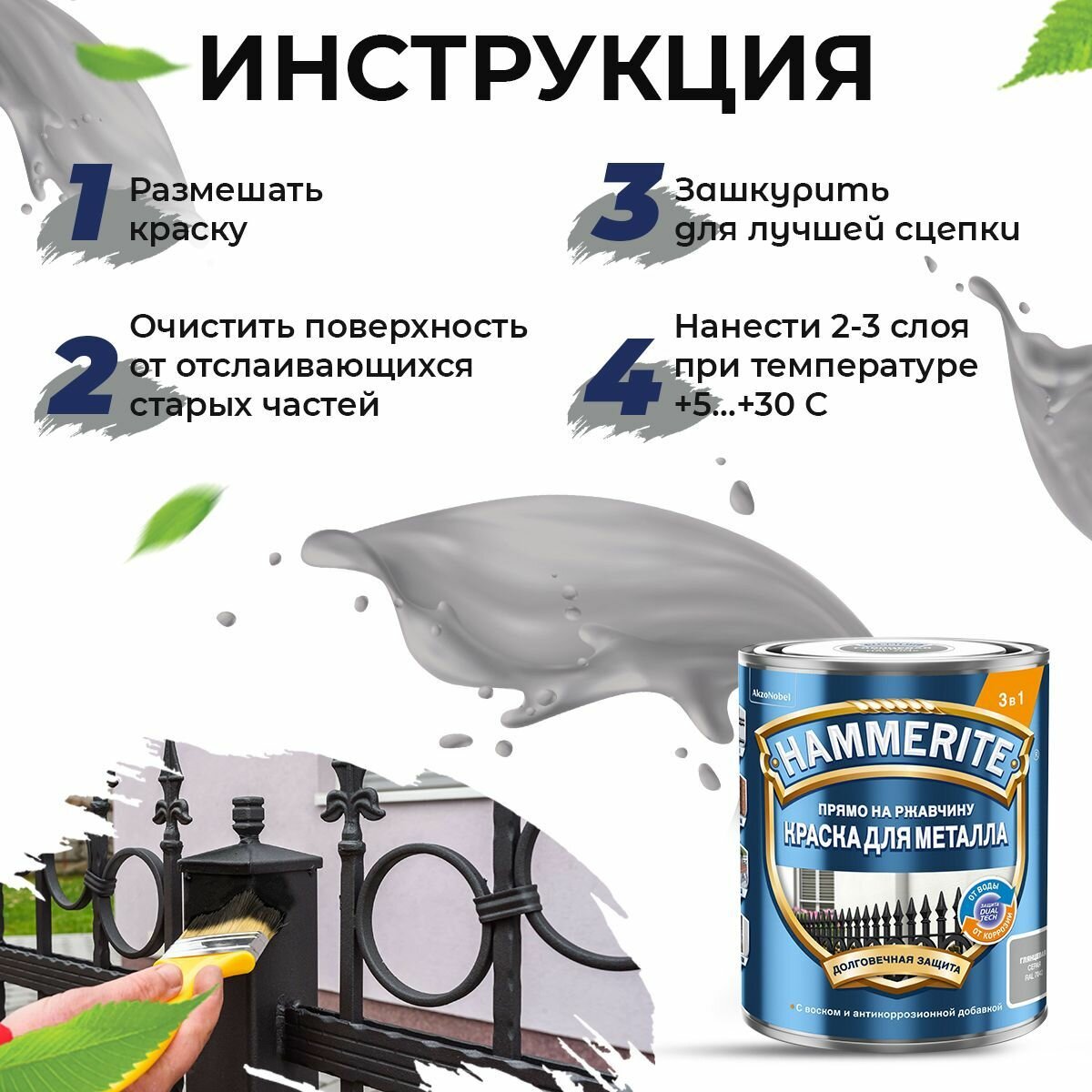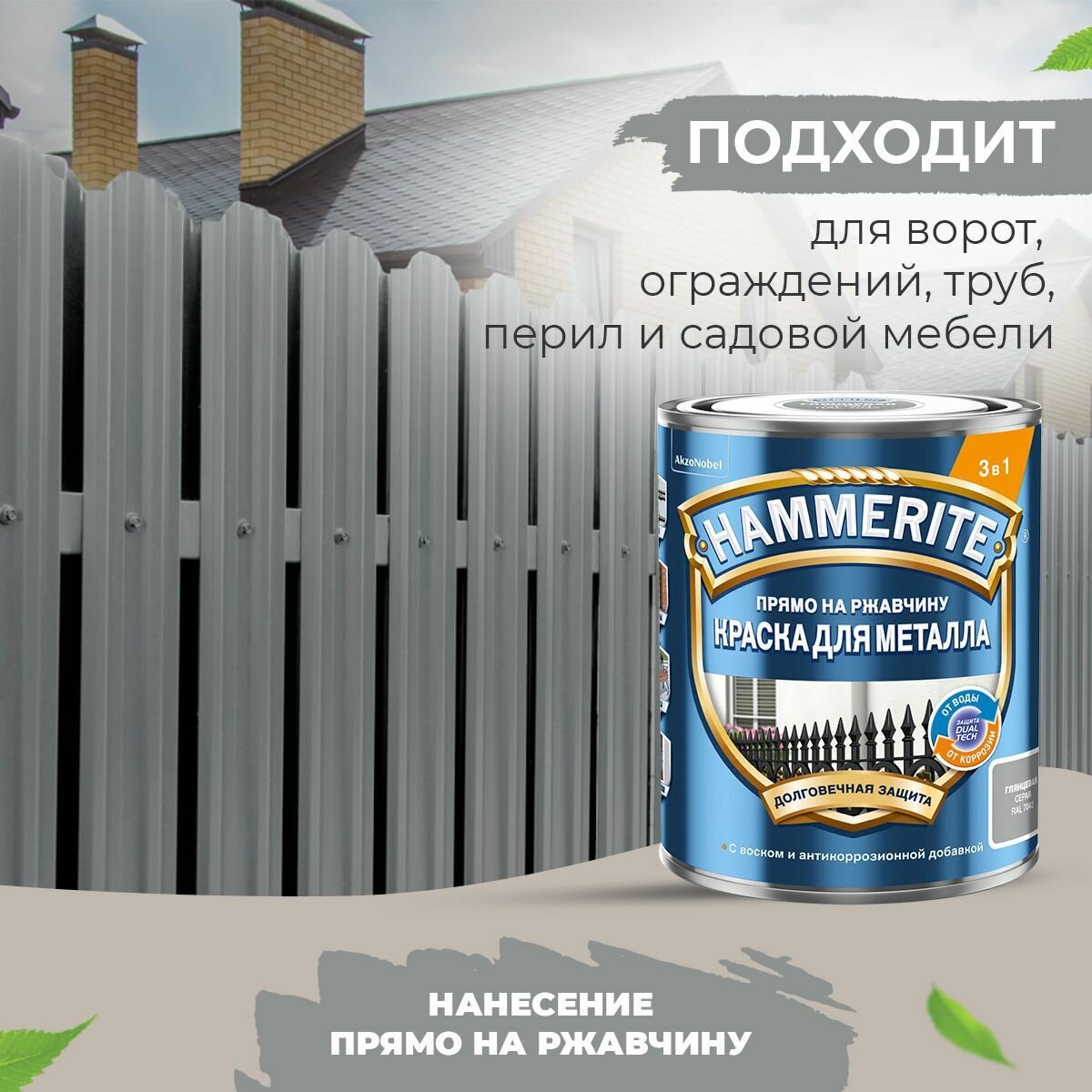 Краска для металла 3 в 1 прямо на ржавчину Hammerite гладкая глянцевая (2л) серый RAL 7042