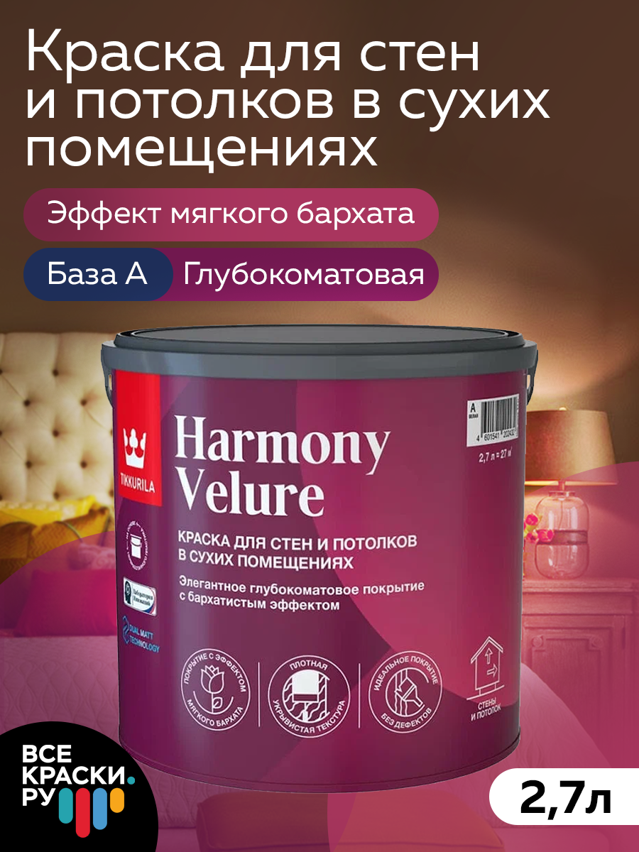 СохранитьКраска интерьерная ВД Tikkurila HARMONY VELURE База A, белый, глубокоматовый 2,7л интересное: