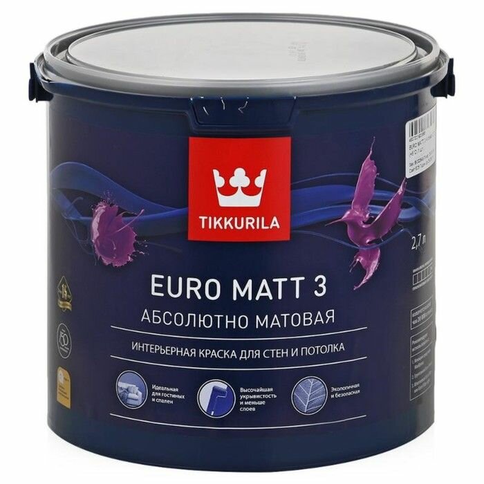 TIKKURILA EURO MATT 3 краска интерьерная для стен и потолков, абсолютно матовая, база C (2,7л)