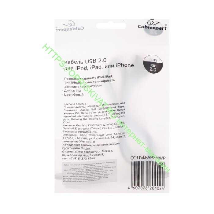 Кабель Cablexpert USB 2.0 - Lughtning 1 метр (CC-USB-AP2MWP), 1043642