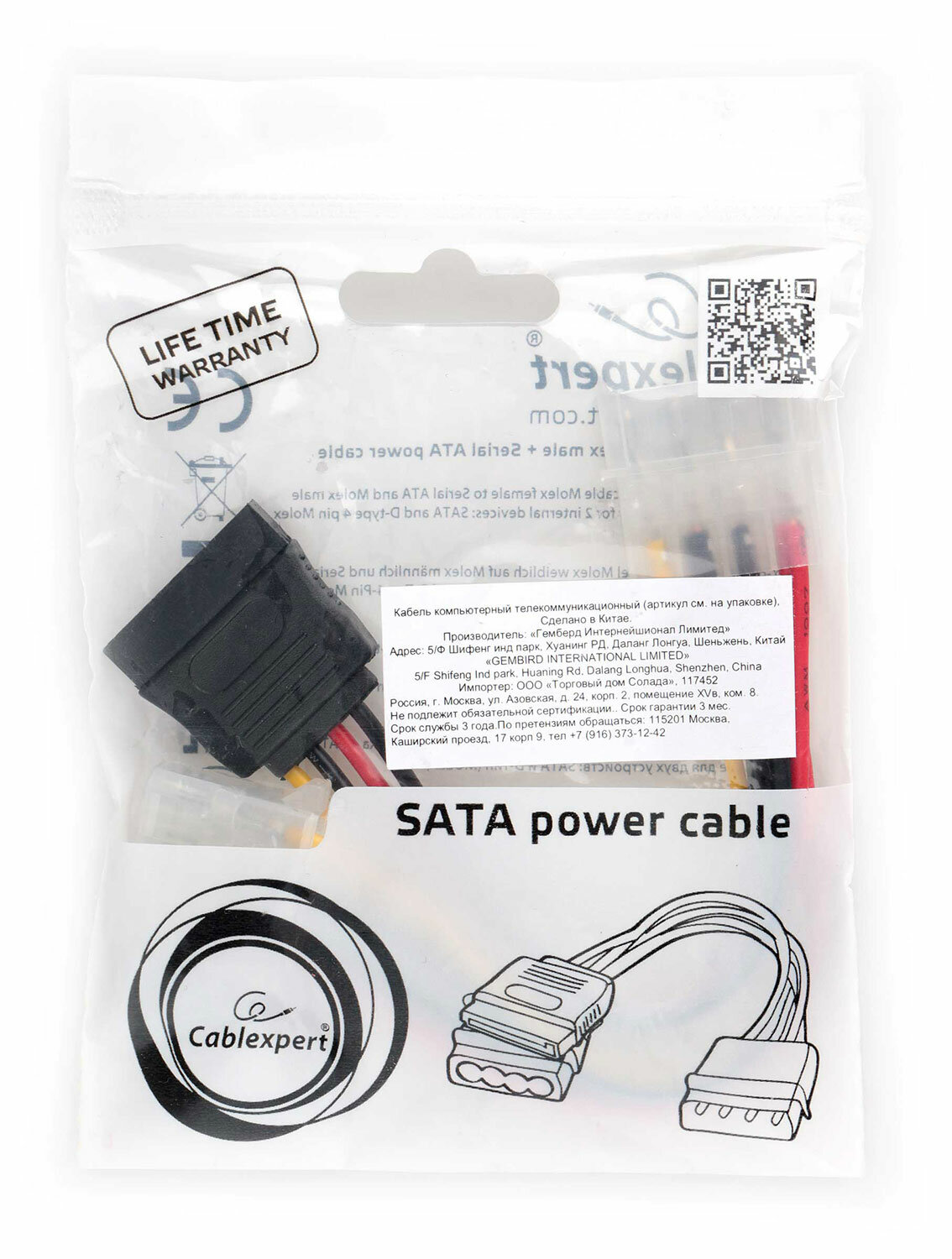 | Разъемы кабеля | Molex 4pin (m+f) - SATA 15pin (m) |