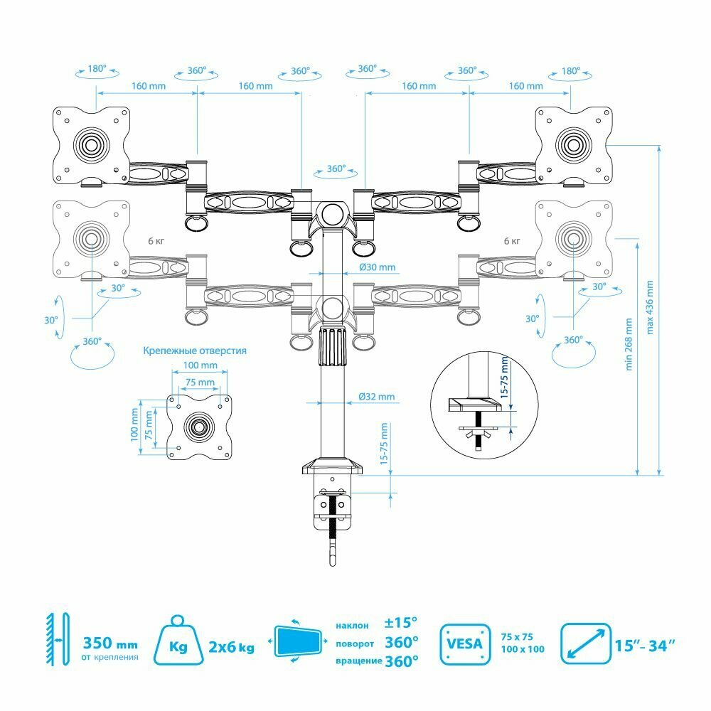 | Отзыв: | Пользуюсь с ~2014 года. Прижимная пластина (на струбцине) маловата - столешница хрустела, пришлось усилить деревяшкой. Толстые кабели (питание, VGA, DVI, плоские HDMI) не умещаются в кабель-каналах. Через год после установки левый монитор (24") начал наклоняться вниз, надо поправлять два раза в день. В остальном ок, хотя вот наклон подбешивает. |