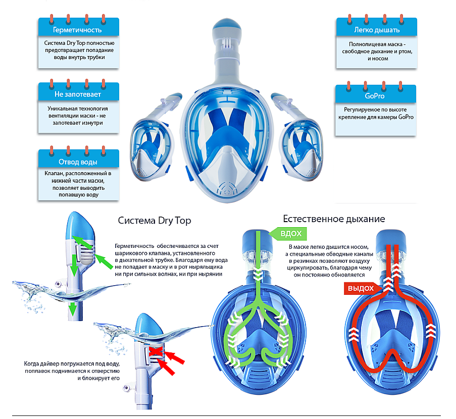 | Минусы: | Маска разделена на две части, глаза и рот с носом. Между носом и глазами есть резиновая перегородка с клапанами работающая в одну сторону от глаз в сторону рта и нос , которая служит для того чтобы воздух при выдохе не попадал на маску , где глаза и стекло не потело и был постоянно приток свежего воздуха из трубки, так же около рта есть клапан для того чтобы воздух выходил при выдохе в воду на прямую, а не через трубку.