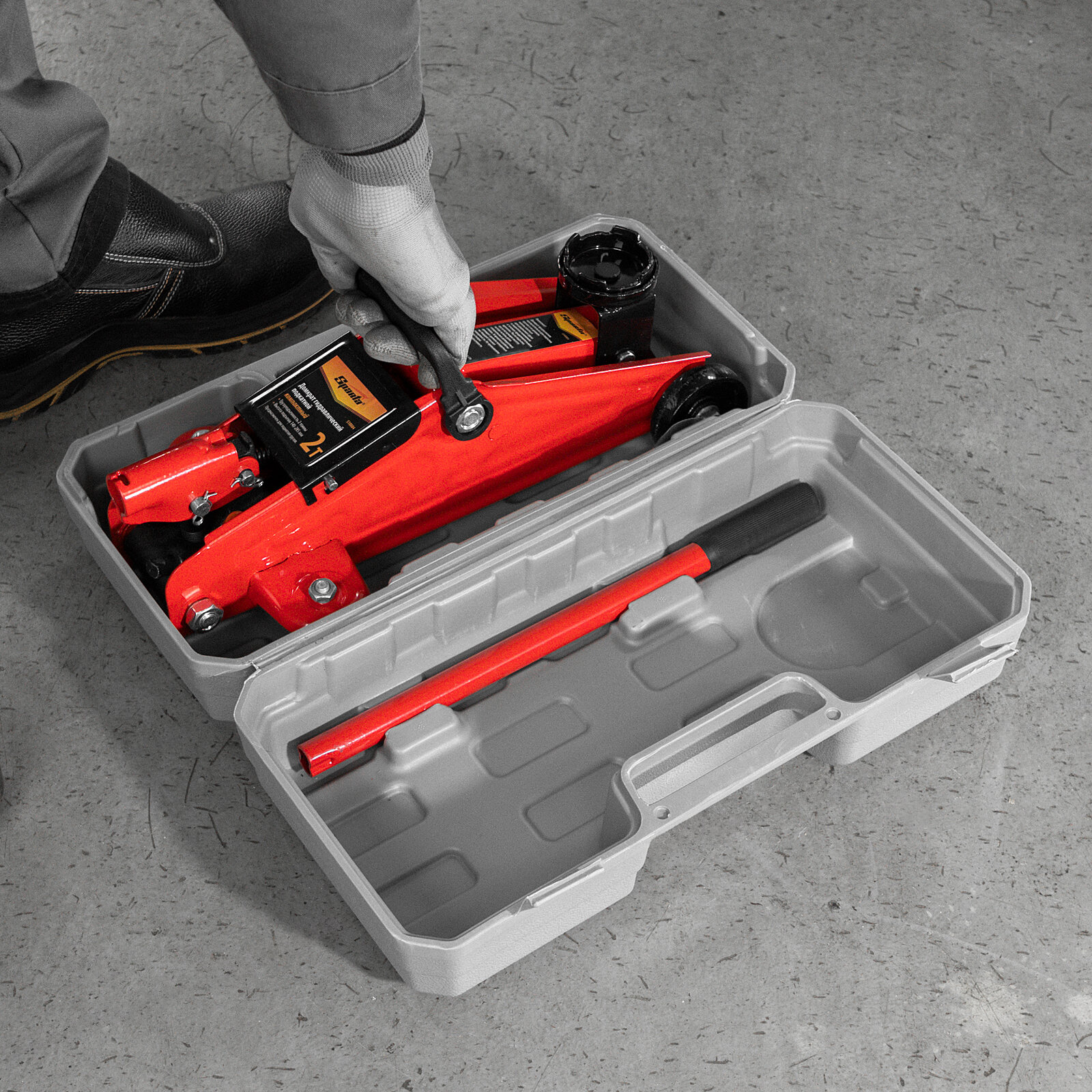Домкрат гидравлический подкатный, 2 тонны, h подъема 140–285 мм, в пластиковом кейсе, compact SPARTA