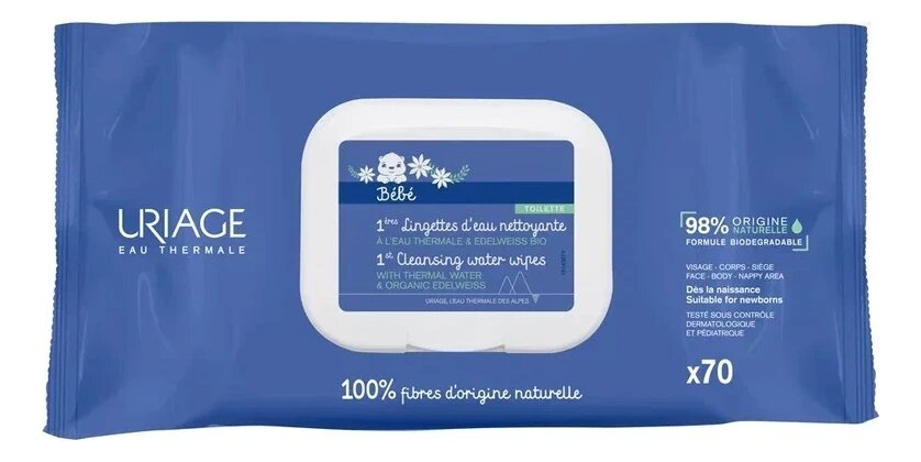 Влажные салфетки Uriage Первые Очищающие Салфетки, пластиковая крышка, 70 шт., 2 уп.