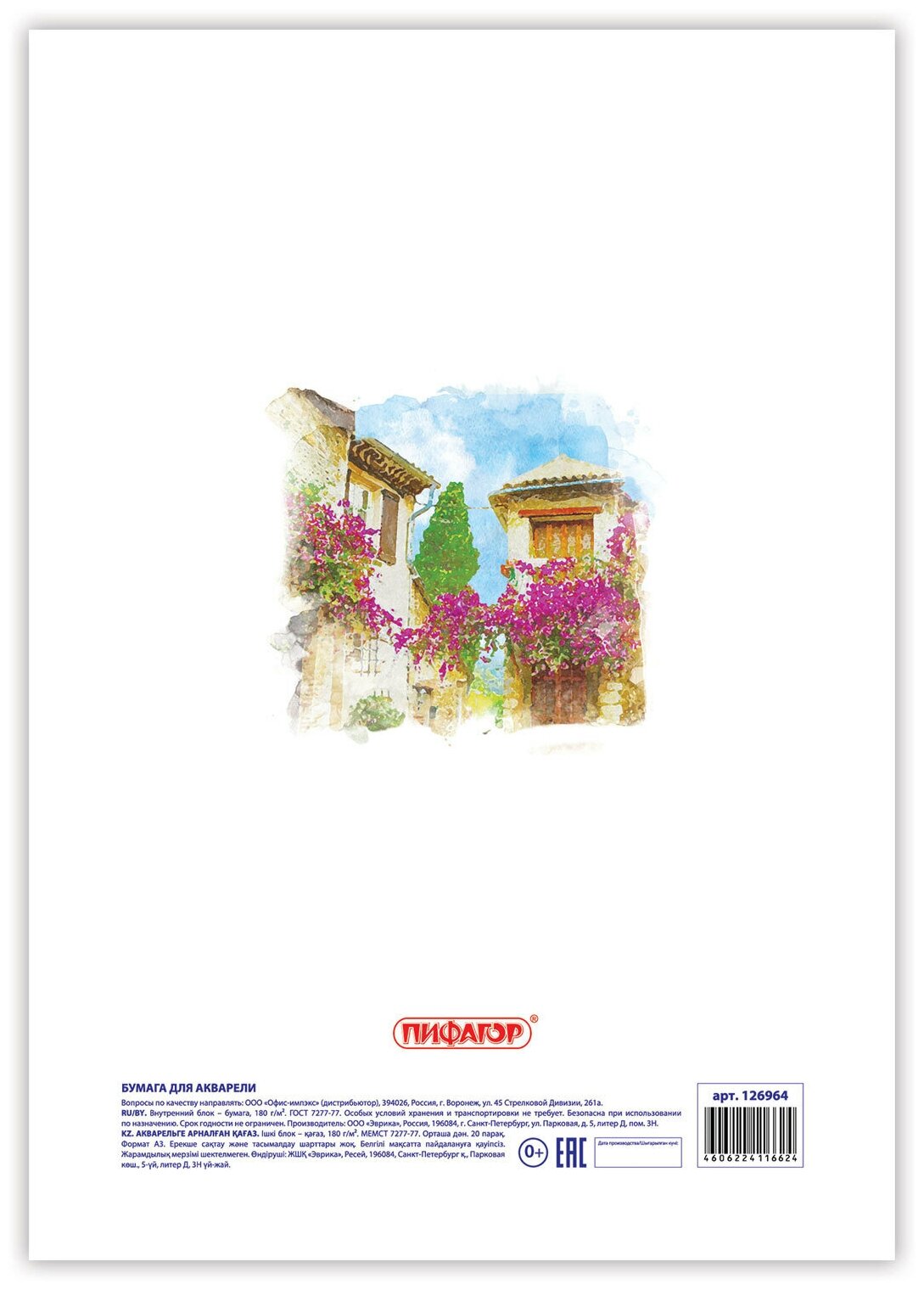 Папка для акварели большого формата А3, 20 л., 180 г/м2, пифагор, 297х420 мм, ГОСТ 7277-77, 126964, 1 шт