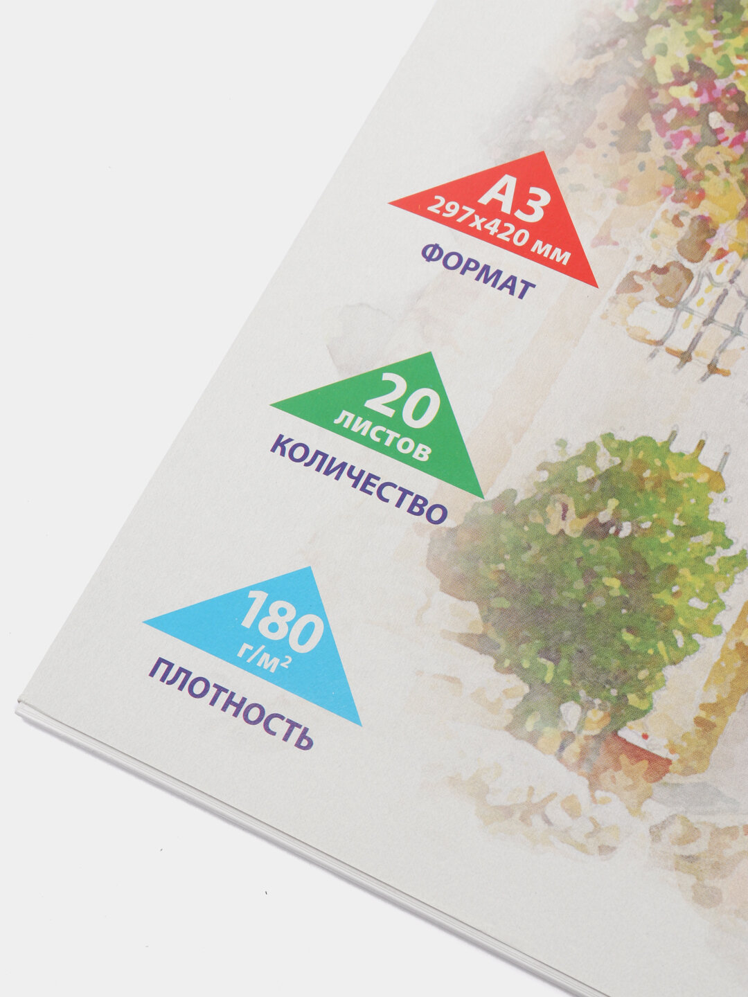 Папка для акварели большого формата А3, 20 л., 180 г/м2, пифагор, 297х420 мм, ГОСТ 7277-77, 126964