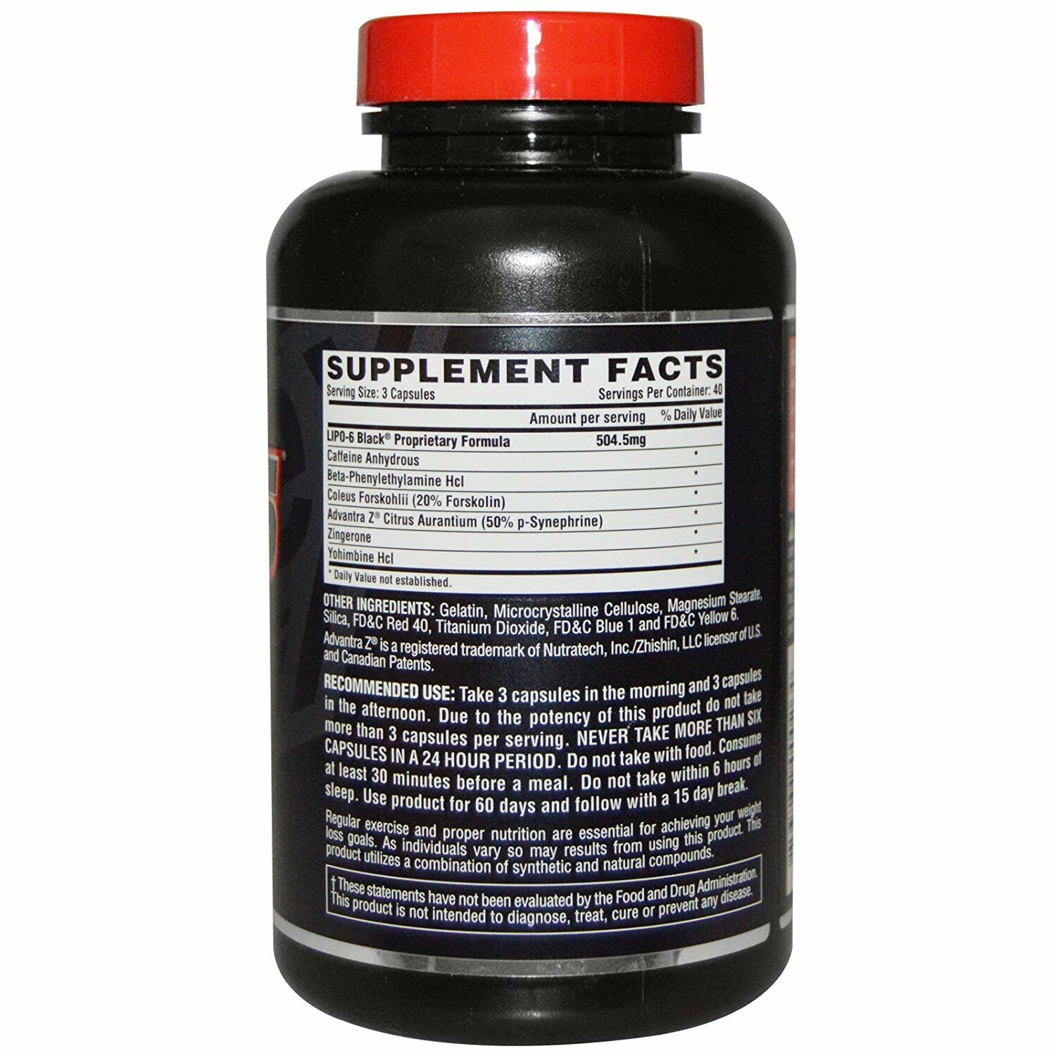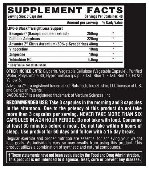 Lipo-6 Black: - Стимулирует центральную нервную систему (ЦНС); - Подавляет аппетит; - Активирует бета-адренорецепторы; - Ускоряет жиросжигательные процессы; - Усиливает синтез катехоламинов; - Вызывает чувство бодрости и хорошего настроения; - Создает ментальную концентрацию, необходимую для тренинга; - Увеличивает термогенез и теплопродукцию; - Ускоряет метаболизм; - Упрощает расщепление жиров в энергообмене. Количество порций - 40, одна порция - 3 капс Состав 1 порции: Фирменный комплекс - 504,5 мг: - Безводный кофеин - Бета-фенилэтиламин - Колеус форсколи (20% форсколин) - Advantra Z Померанец (50% синефрин) - Зингерон (Zingerone) - Йохимбин Ингредиенты: Глицерин, целлюлоза, вода, полисорбат 80, гипромеллоза, красители. Способ применения: Первый прием должен быть сразу после пробуждения или за 20-30 минут до завтрака. Второй прием добавки должен быть перед тренингом, за 30-40 минут до его начала. Постарайтесь выпивать капсулы на пустой желудок. Разовая порция при каждом употреблении – 3 капсулы, т.е. 6 капсул в сутки. Не используйте более 8-9 в течение 24 часов. В ином случае возможны негативные последствия. Курс приема добавки должен длиться 3-4 недели. Затем необходимо отдохнуть от неё в течение 10-14 дней, не употребляя при этом другие продукты, содержащие стимулирующие вещества, в первую очередь другие жиросжигатели и предтренировочные комплексы. Данный способ периодизации позволяет избежать толерантности к компонентам и различных побочных эффектов.?? |