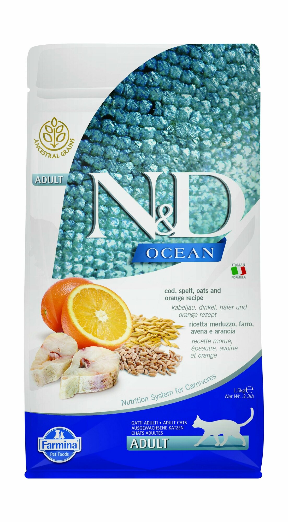 FARMINA CAT N&D OCEAN CODFISH SPELT OATS & ORANGE низкозерновой для взрослых кошек с треской, спельтой, овсом и апельсином (1,5 кг)
