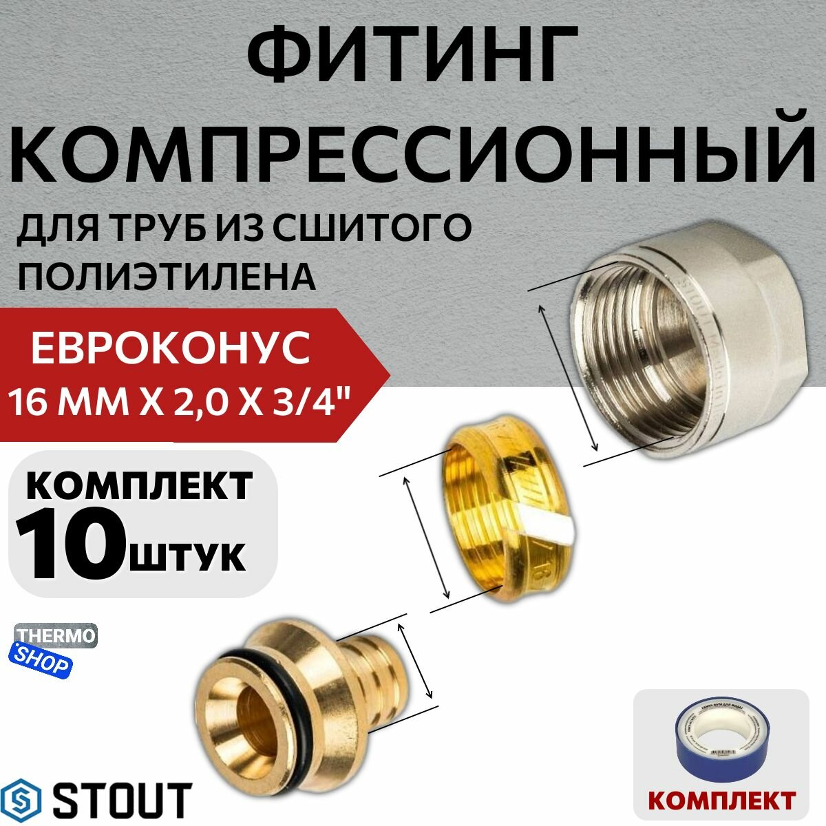 Фитинг компрессионный 10 шт для труб PEX (евроконус) 16х2,0х3/4" ФУМ лента 10 м