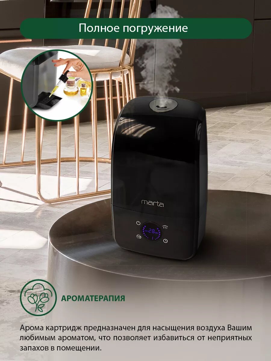 Пользуюсь увлажнителем воздуха MARTA с начала отопительного сезона. Приобрела для квартиры, так, как в доме 2 детей, а воздух сухой. Удобное сенсорное управление. Объем 3 литра, мне хватает на сутки. Если вода закончилась, он сам отключается. А это очень удобно, не нужно боятся, что перегорит. Мощность испарения можно регулировать. Для площади 35 кв. метров, мне его вполне хватает.