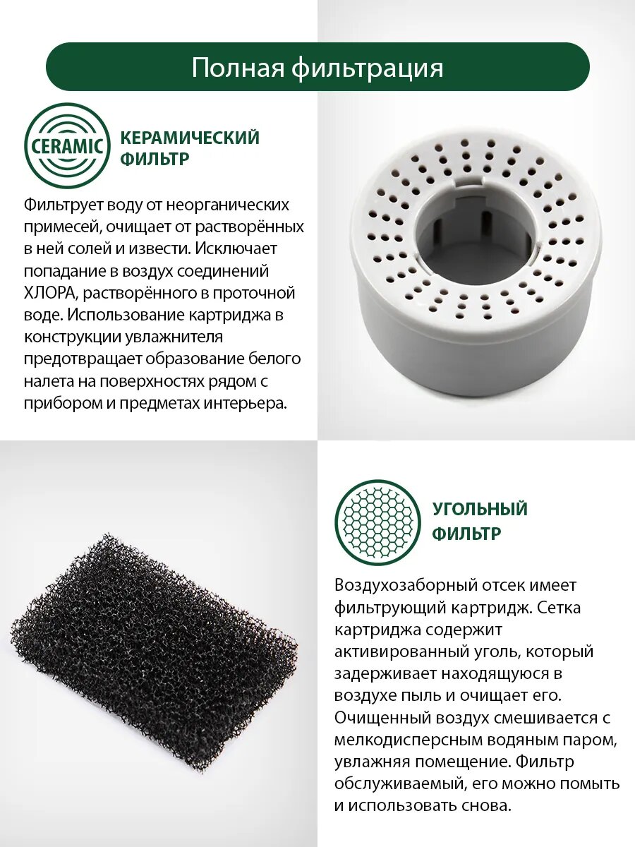 Мощная подача увлажнения, площадь 59 кВ , и конечно литраж большое на ночь и почти день хватает ! И небольшой фильт с возможностью заменой наполнителя онизации .