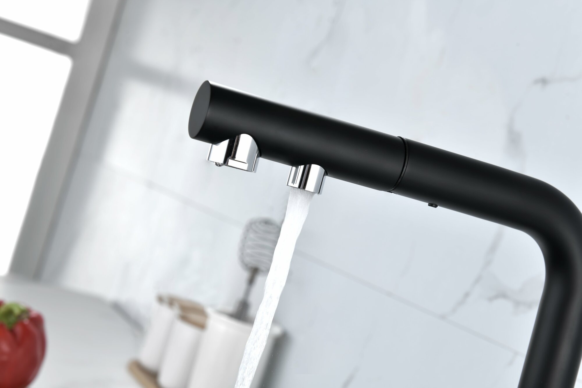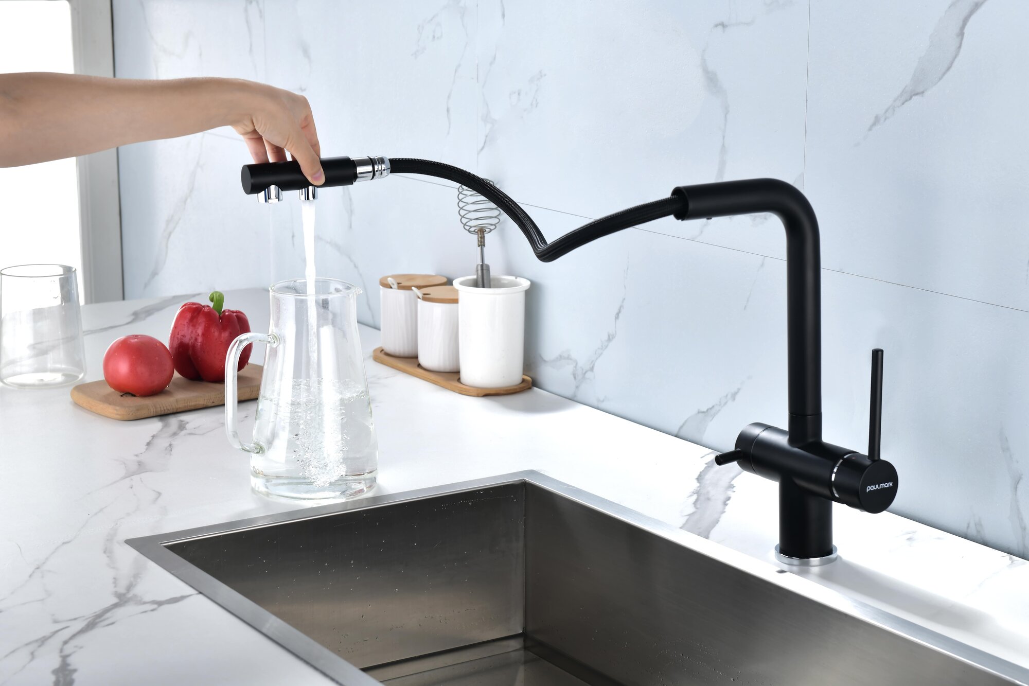 Кухонный смеситель с гибким выдвижным изливом Paulmark SERPENTINE, подключение к системе фильтрации воды по отдельному каналу, Г-образный, латунь, на мойку / столешницу, черный металлик, Se213222-418