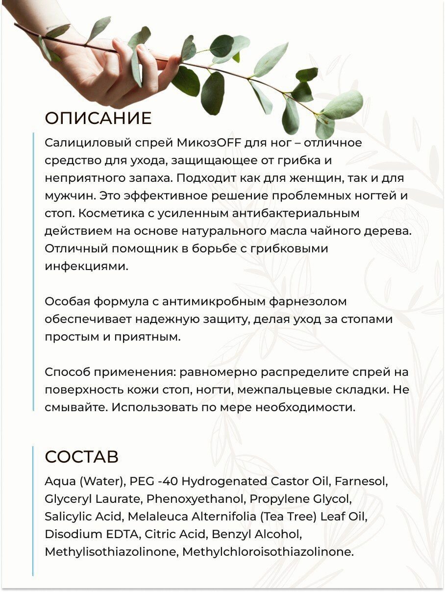 Салициловый спрей для ног "МикозOFF гигиенический" фарнезол и чайное дерево, 190 мл