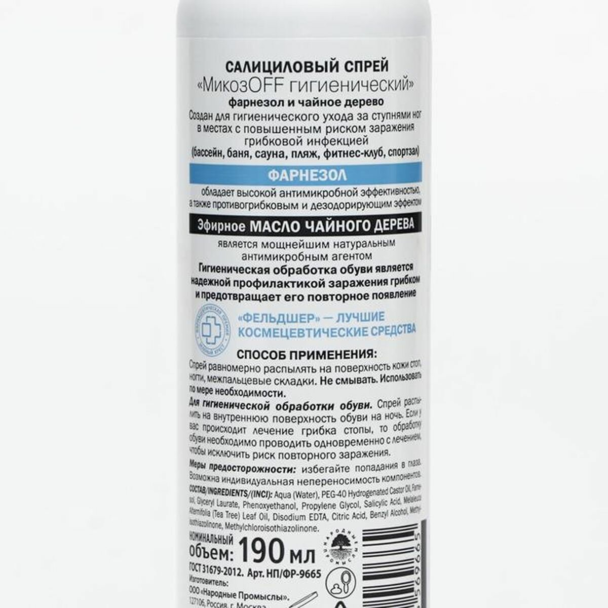 Салициловый спрей для ног Фельдшер"МикозOFF гигиенический" фарнезол и чайное дерево, 190 мл 27606 .