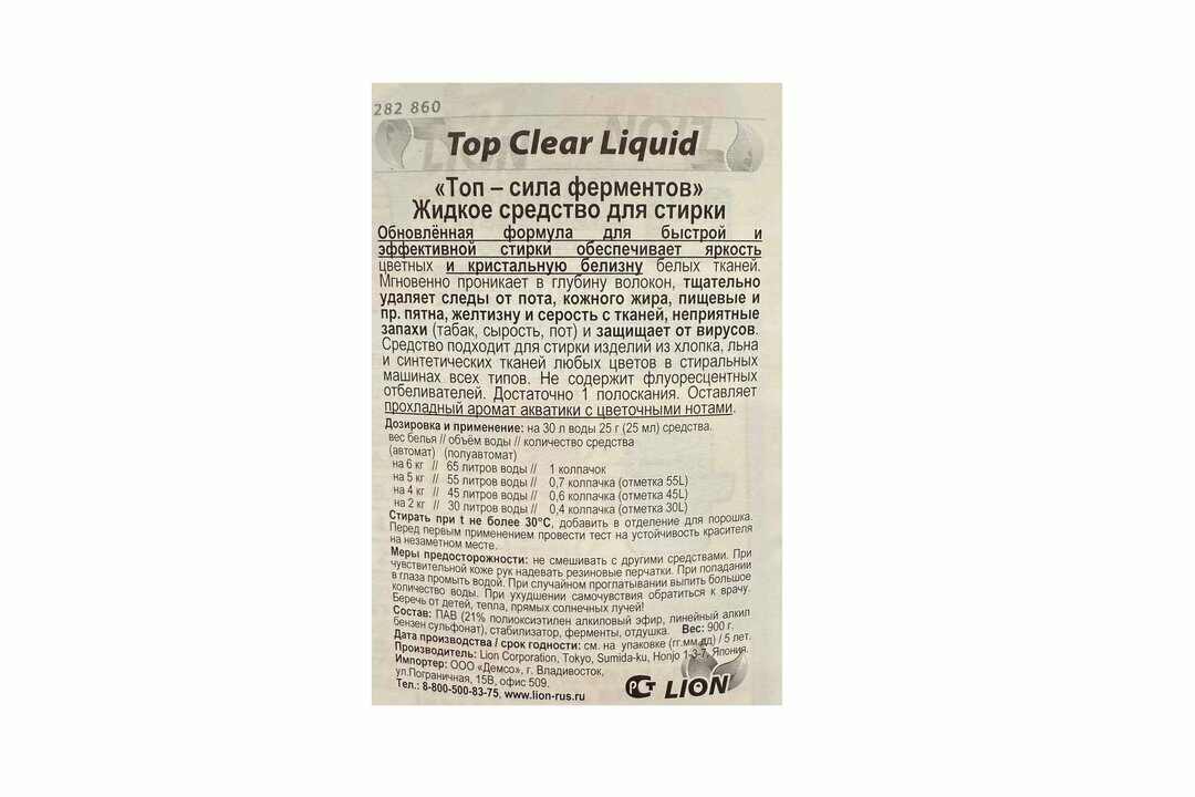 Lion top clear liquid жидкое средство для стирки белья с антибактериальным эффектом "топ-сухое бельё", 900 гр.