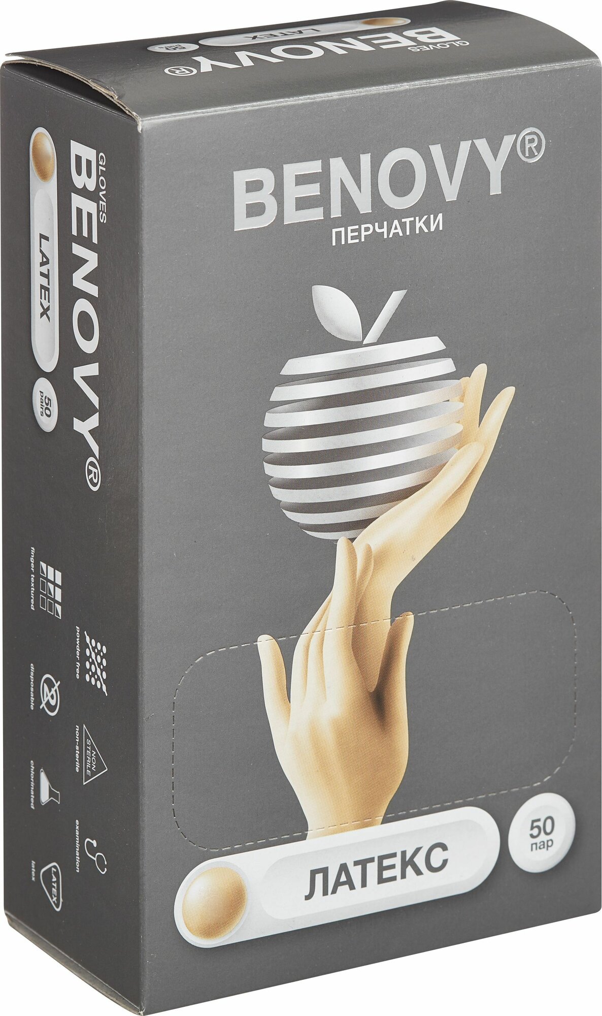 Benovy Latex Powdered - Бинови Перчатки латексные опудренные, цвет натуральный, M, 50 пар/уп -