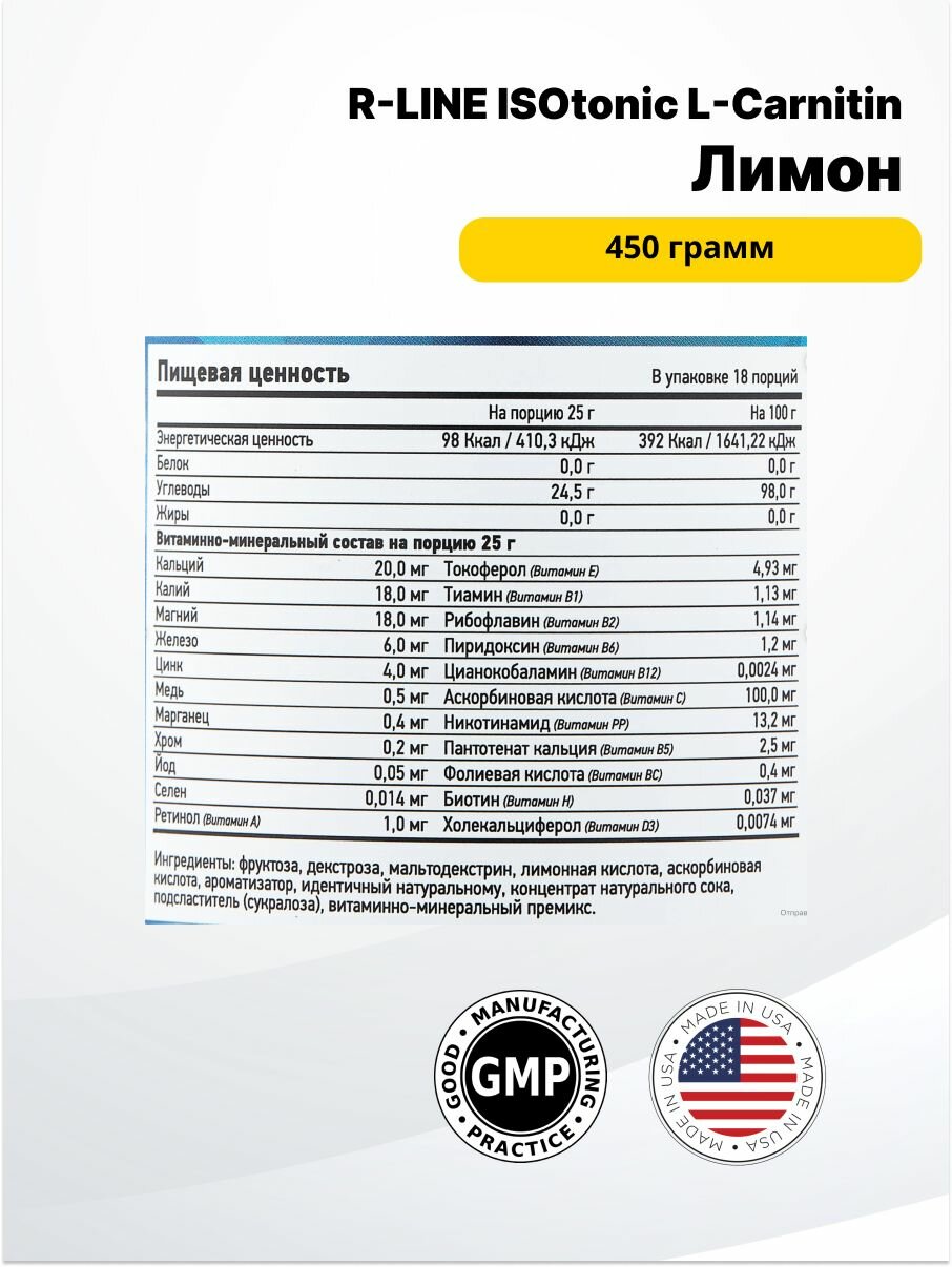 Изотоник + L- карнитин RLine ISOtonic L-Carnitin, лимон, 450 гр. спортивный напиток для похудения + витамины