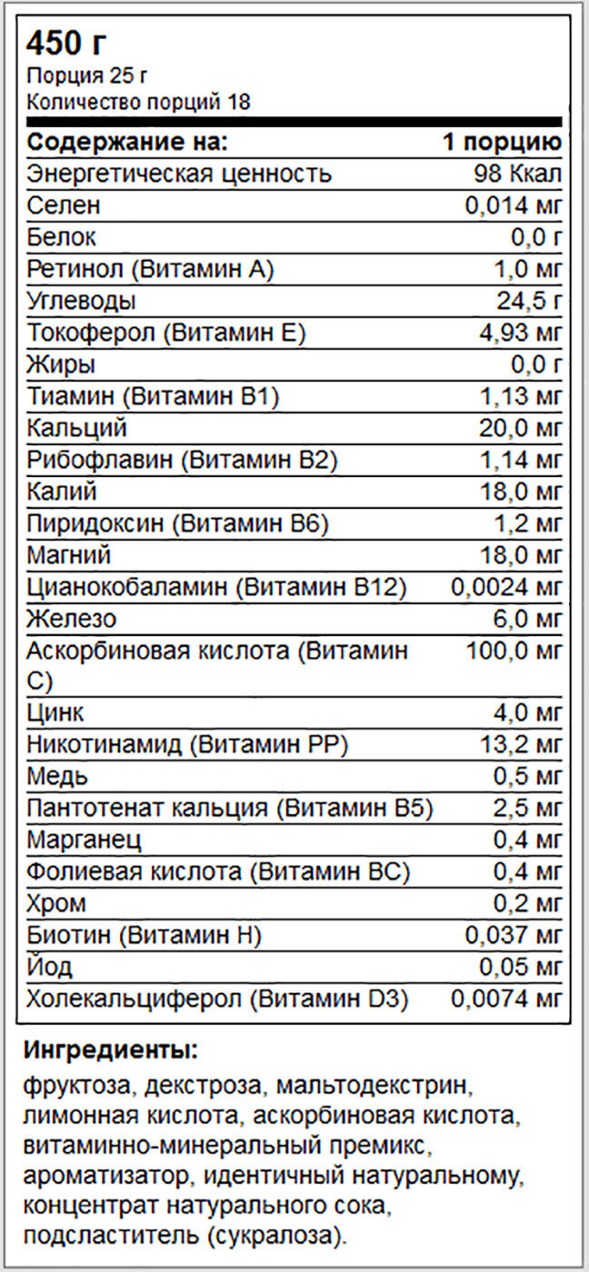 | Отзыв: | Был удивлён. Без сахара и такой сладкий из за сублимированного сока. В компонента с витаминами идеальное сочетание. Мерная ложечка для удобства. |