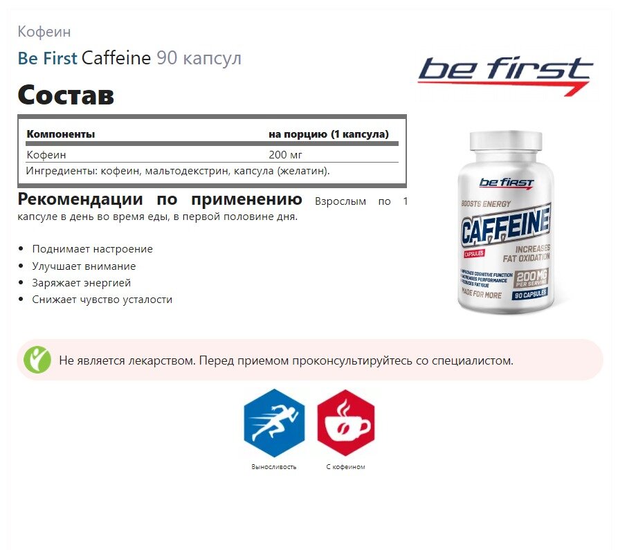 Ниже Вы можете прочитать отзывы на Caffeine 200 мг 90 капс (Be First), ознакомится с подробными характеристиками, посмотреть интересные обзоры и фотографии на Caffeine 200 мг 90 капс (Be First).