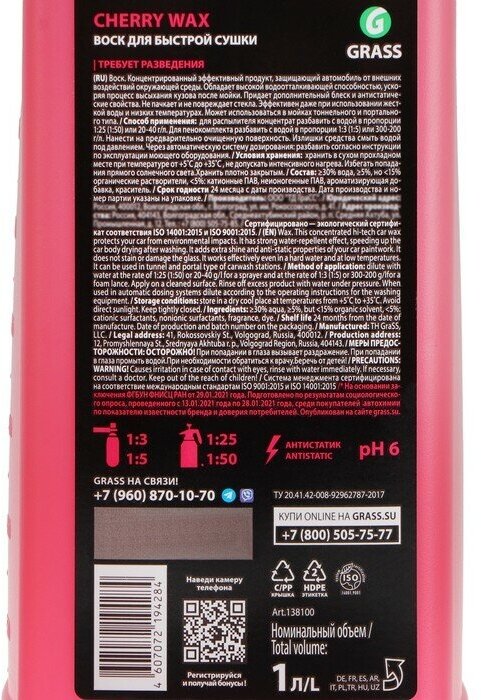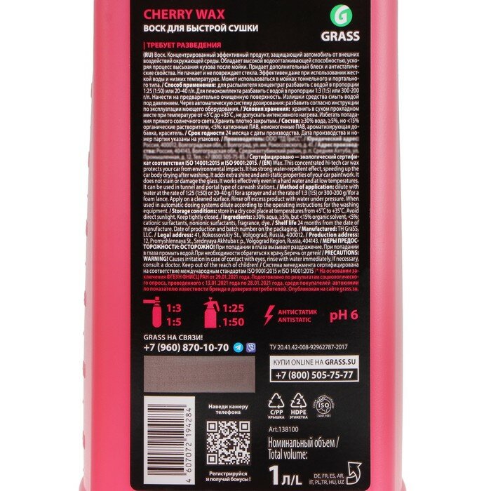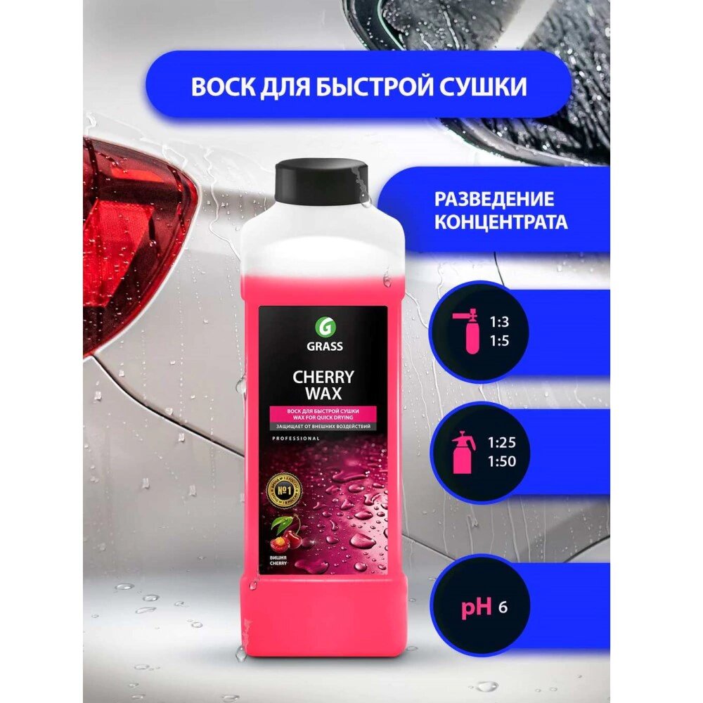 СохранитьВоск для кузова 1л - холодный Cherry Wax: ускоряет высыхание и защищает кузов, безопасен для стекол, подходит для моек тоннельн/портального типа, концентрат 1:25-1:50 GRASS 138100 | цена за 1 шт интересное: