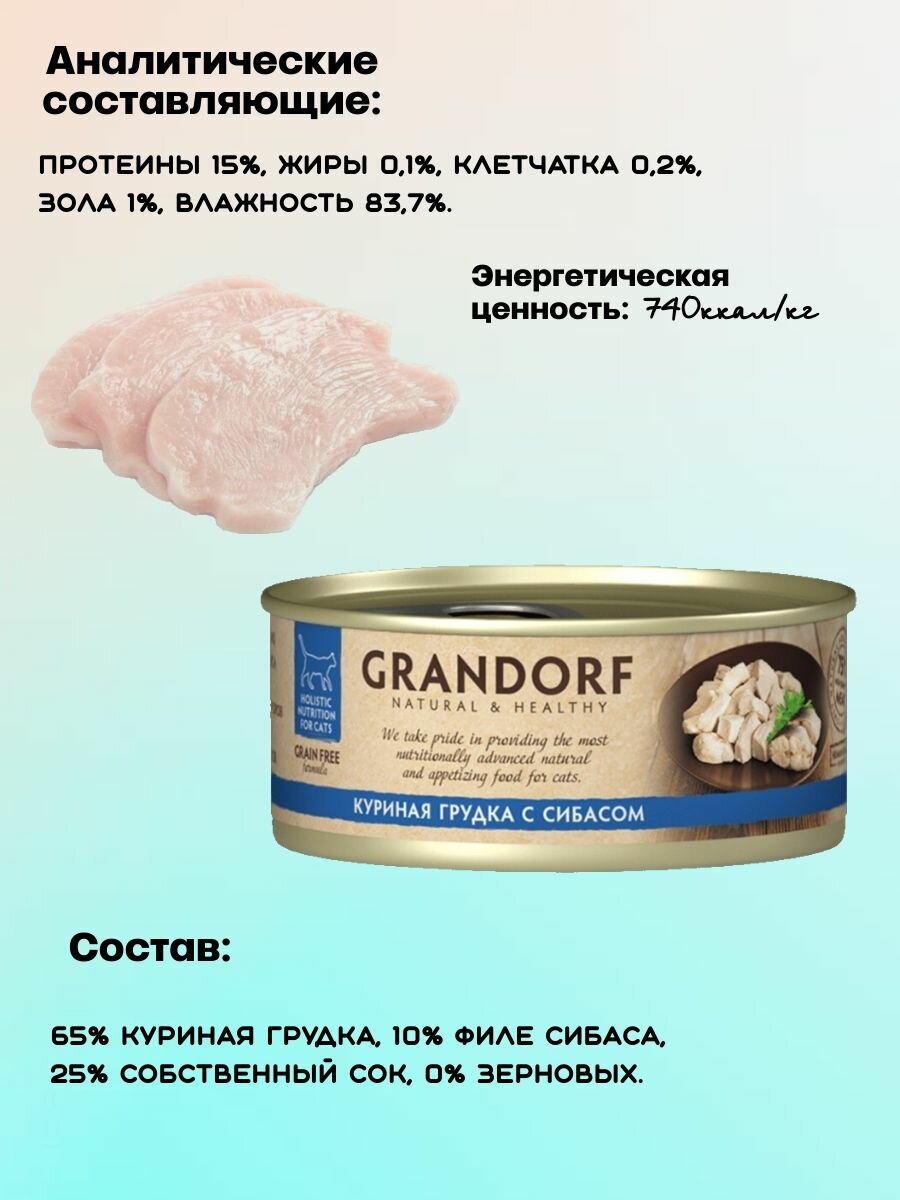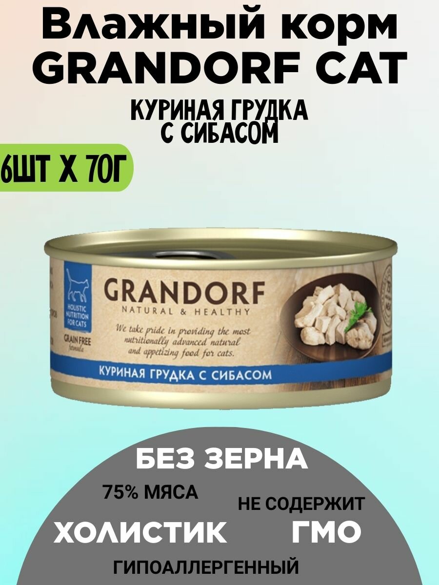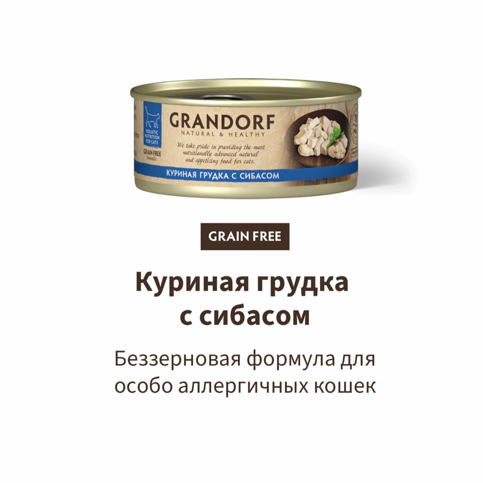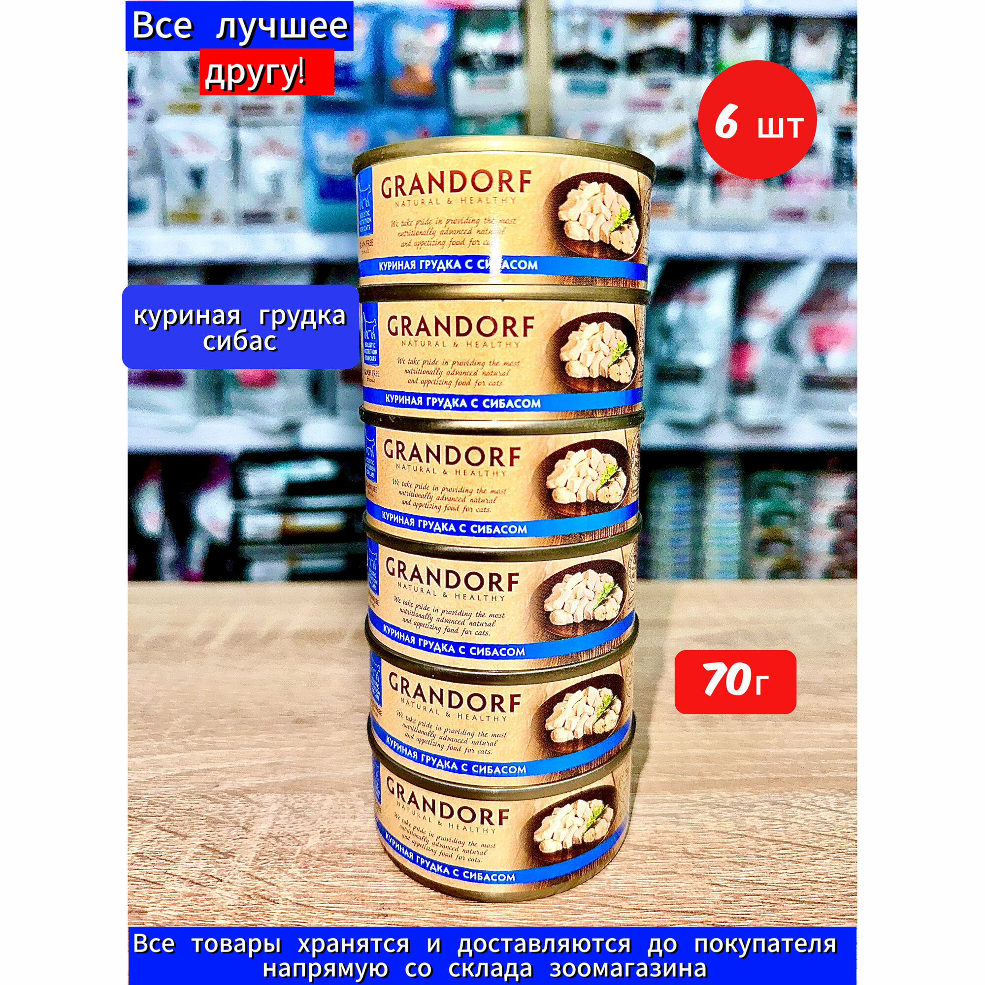 Купить GRANDORF влажный корм для кошек, куриная грудка с сибасом, упак. 6 банок по 70 гр