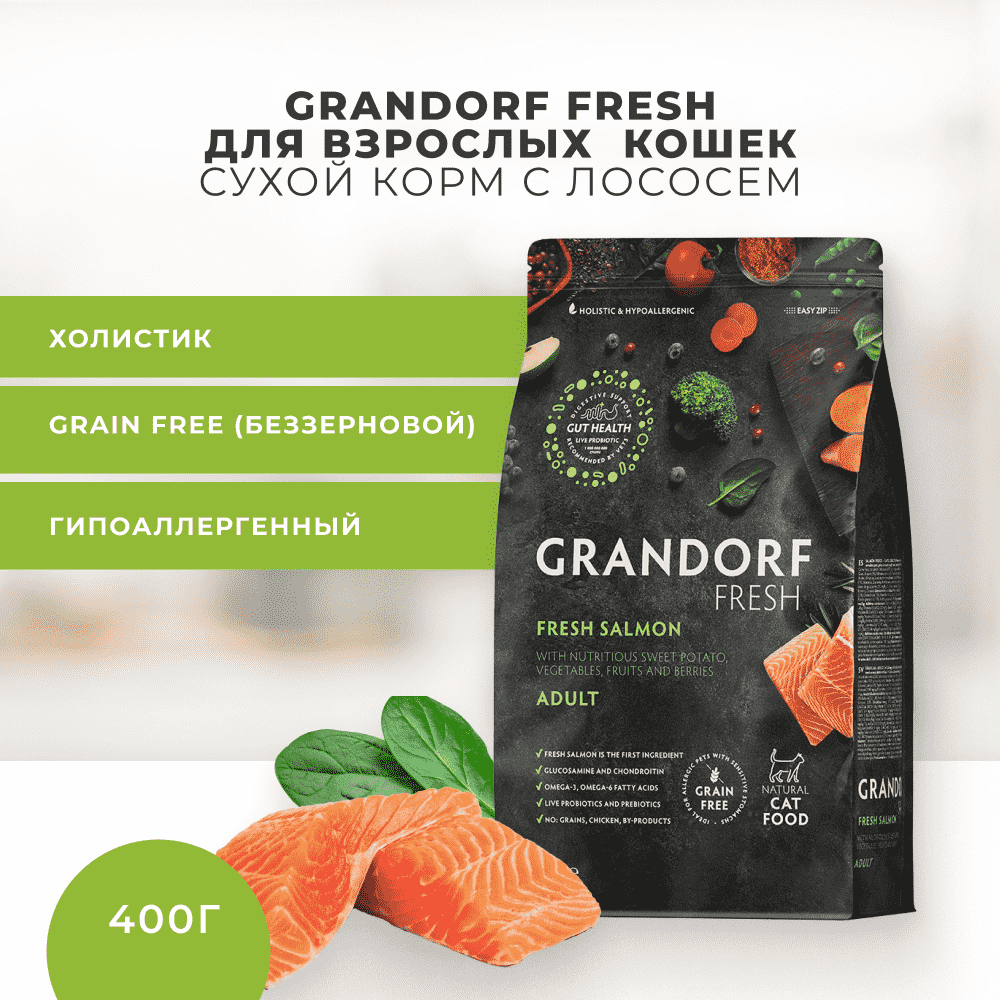 Купить Сухой беззерновой корм для взрослых кошек грандорф фреш (GRANDORF FRESH). Филе Лосось, Батат - 400 гр
