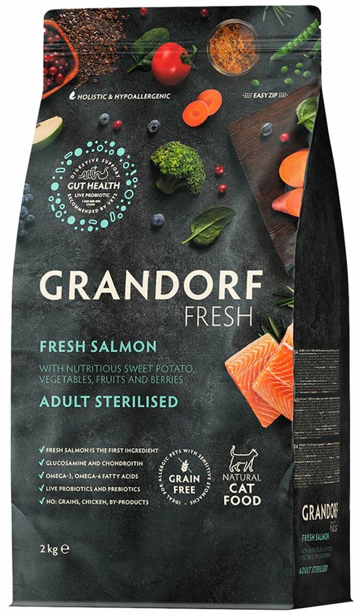 Сухой беззерновой корм Grandorf Fresh свежее филе лосося с бататом, с живыми пробиотиками для стерилизованных ИЛИ пожилых кошек, 2 кг