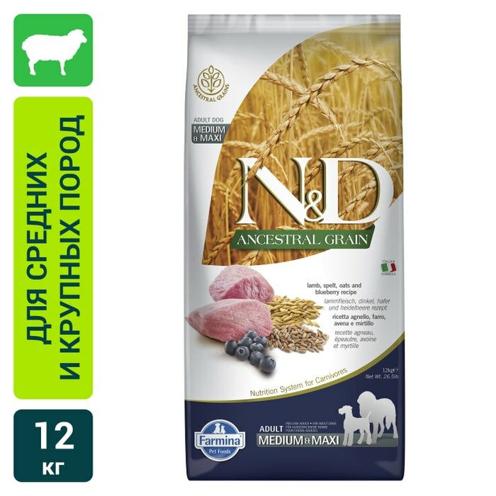 Сухой корм Farmina N&D Ancestral Grain Lamb & Blueberry Adult Medium & Maxi, низкозерновой, для взрослых собак средних и крупных пород, ягненок и черника, 12 кг