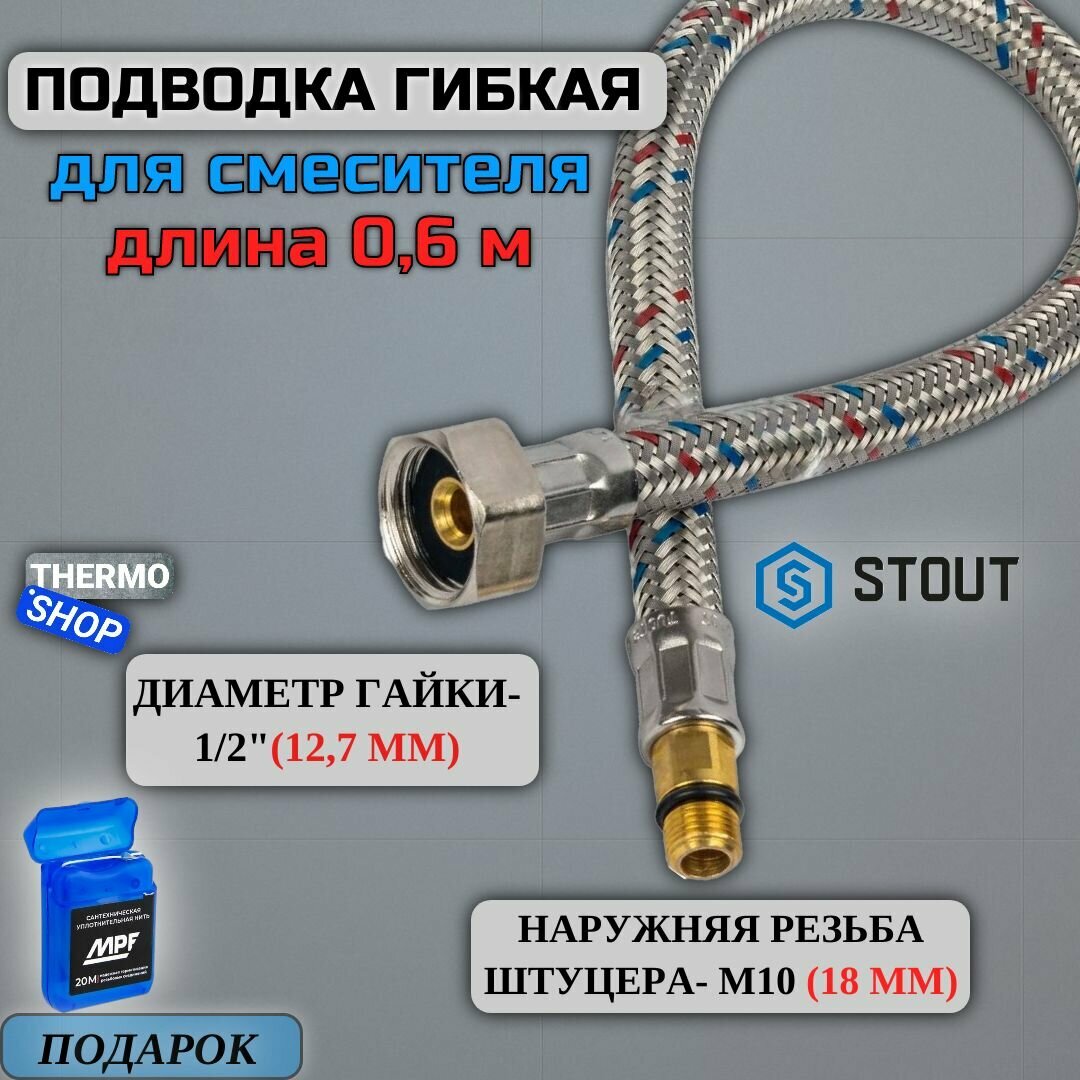 Гибкая подводка для воды Stout , M 10 (18мм) х ВР 1/2, длина 1200 мм