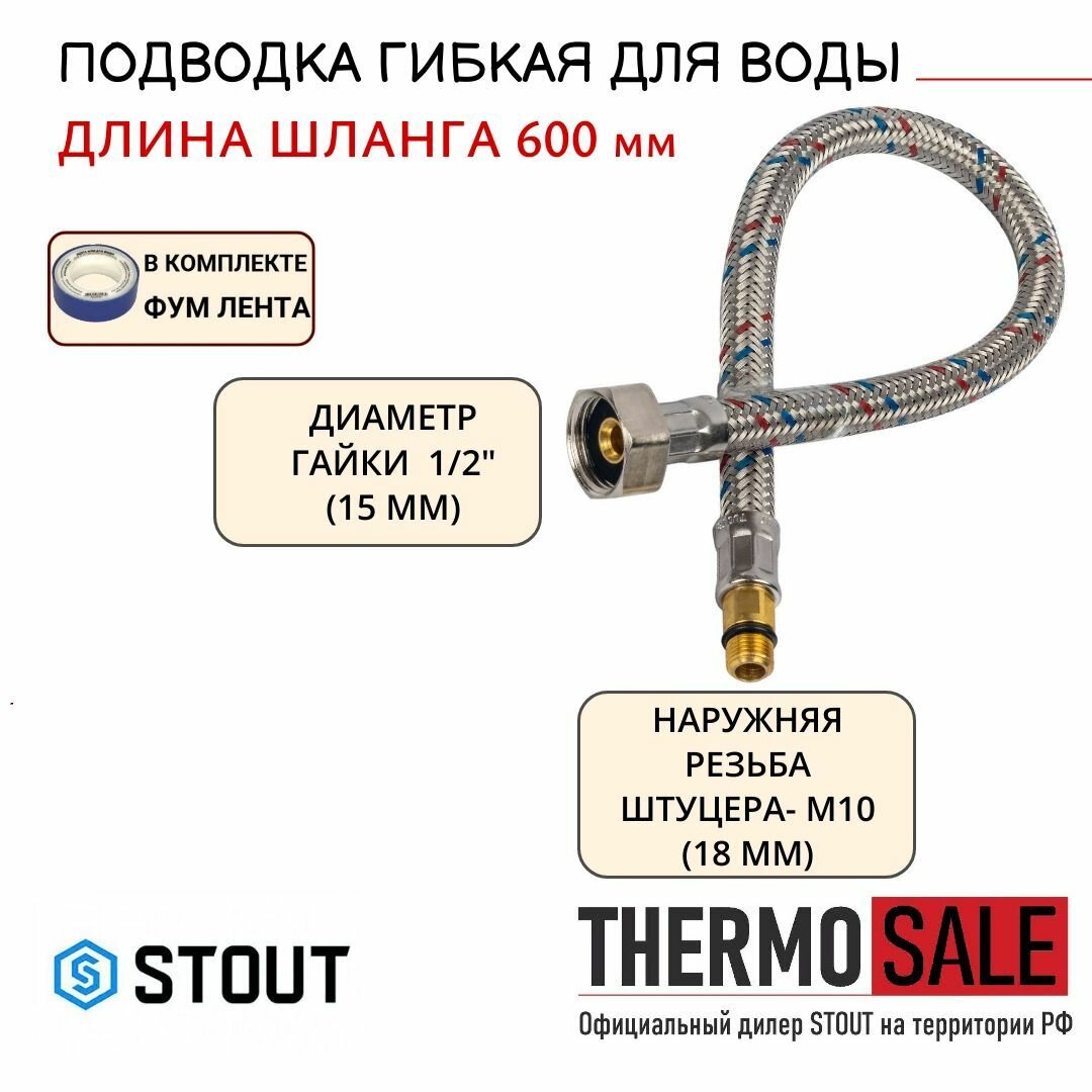 STOUT Гибкая подводка для воды M 10 (18мм) х ВР 1/2, длина 600 мм