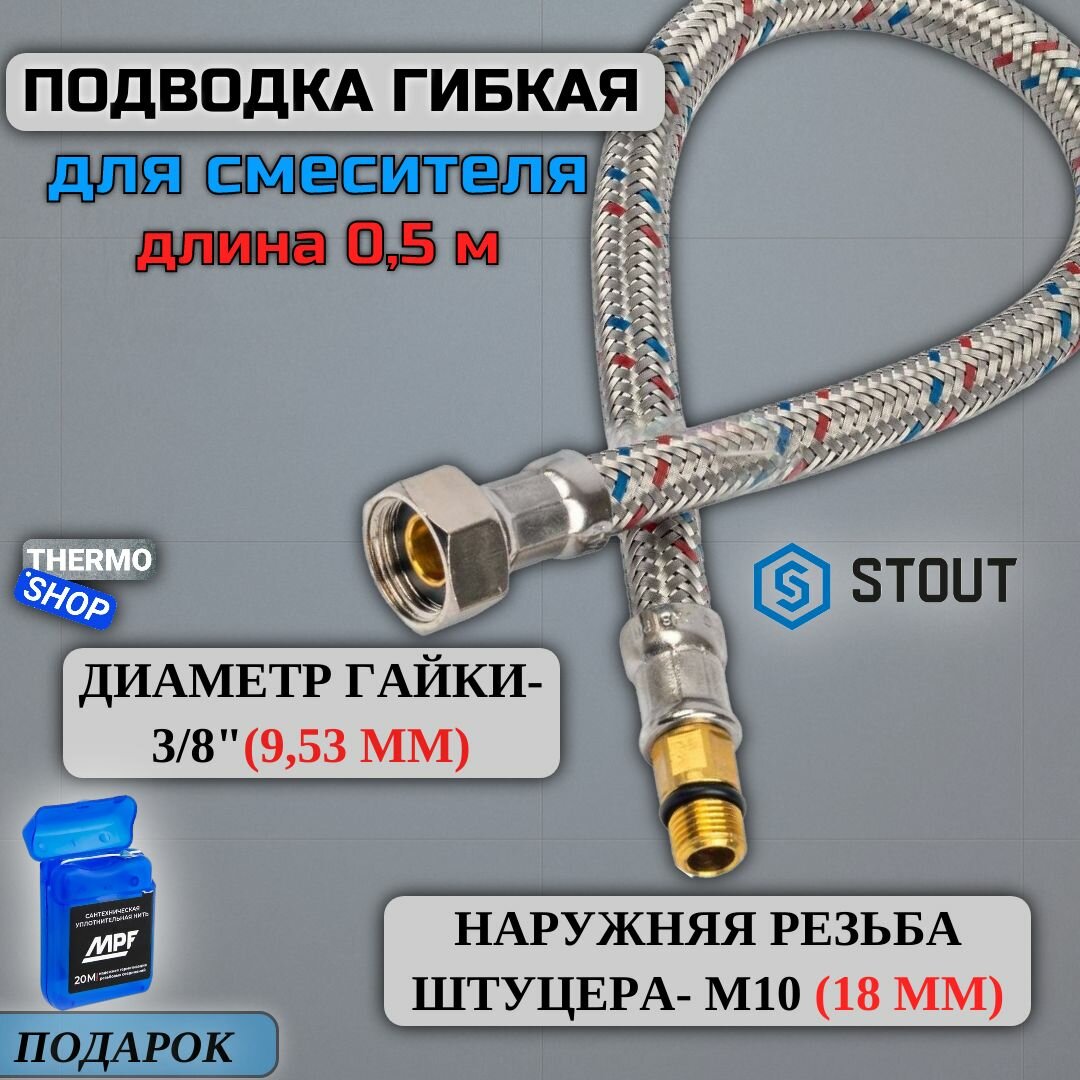 Купить Гибкая подводка для воды M 10 (18мм) х ВР 3/8, длина 500 мм Сантехническая нить 20 м