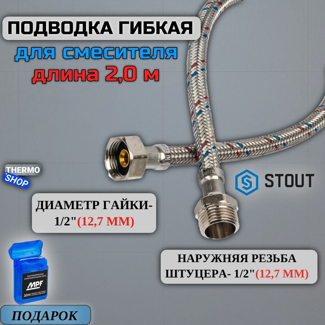 Гибкая подводка для воды Stout , НР 1/2 х ВР 1/2, длина 2000 мм
