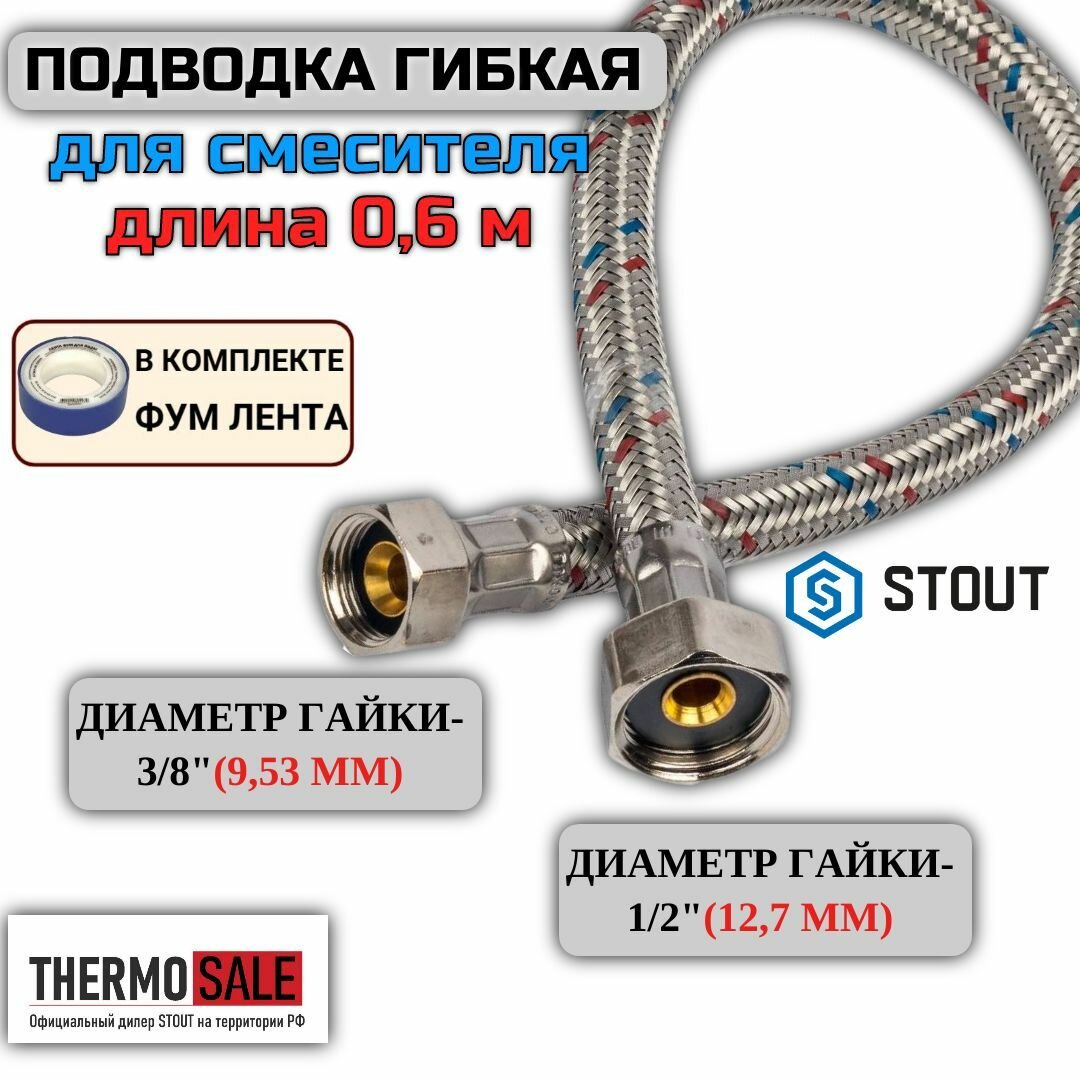 Гибкая подводка для воды STOUT ВР 1/2 х ВР 3/8 длина 600 мм