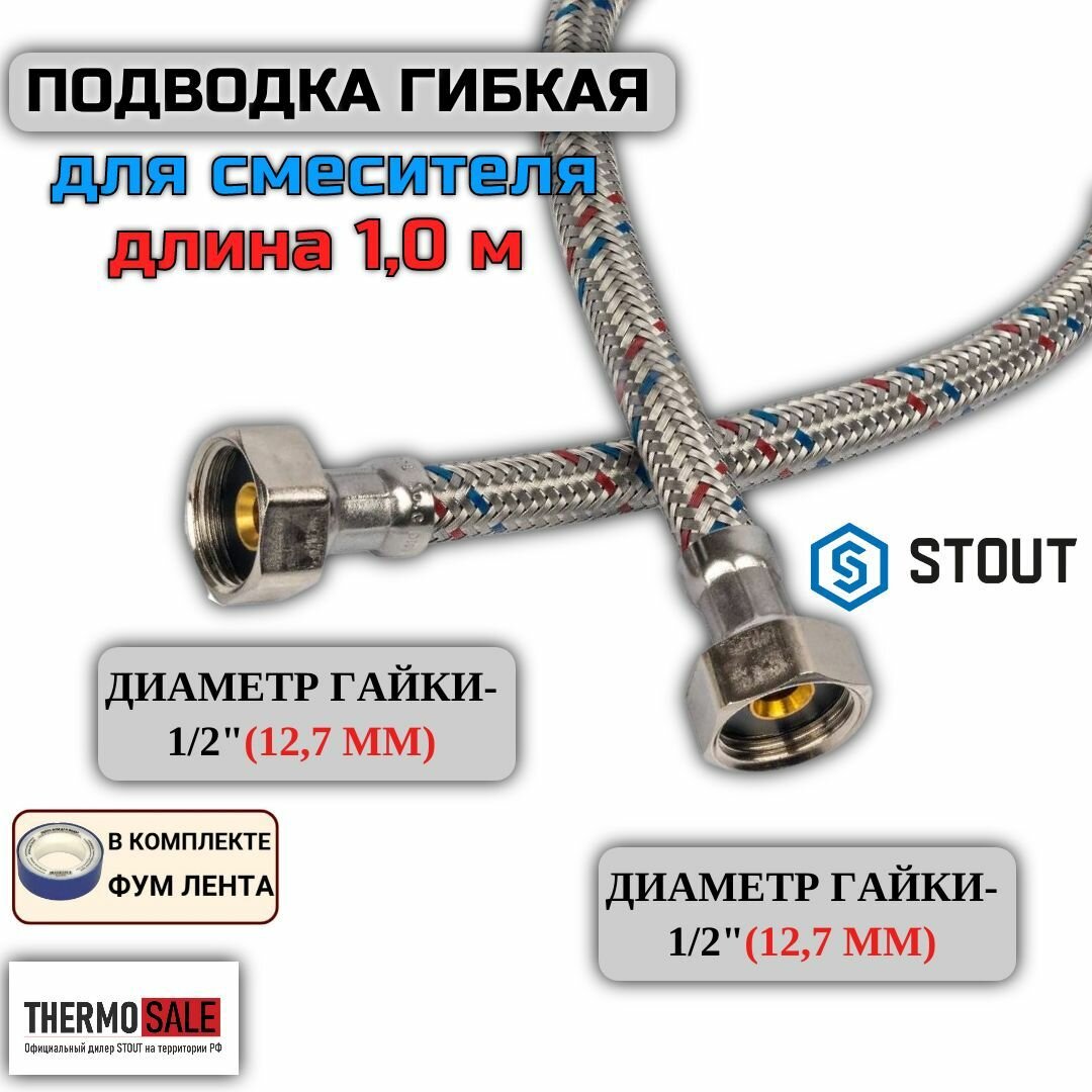 Гибкая подводка для воды Stout ВР 1/2 х ВР 1/2, длина 1000 мм